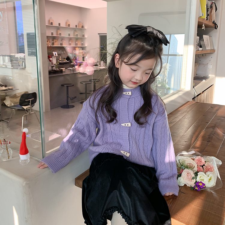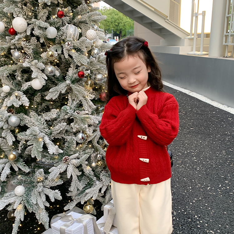 依依妈女童冬装新年毛衣儿童年服宝宝洋气牛角扣针织开衫加厚外套