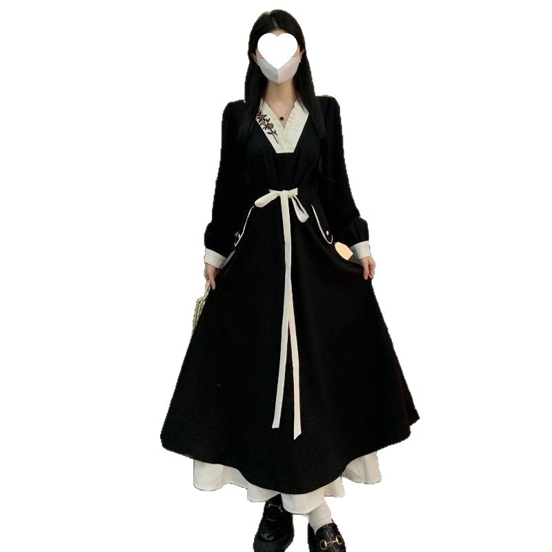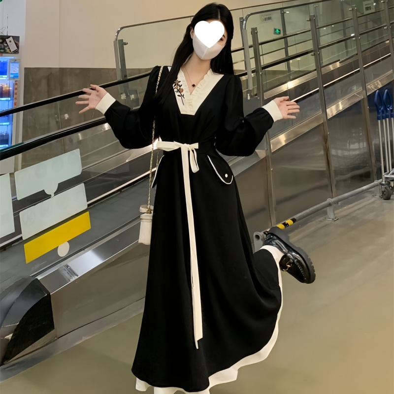 秋季新款大码胖mm法式V领刺绣黑色长袖连衣裙女收腰显瘦赫本长裙