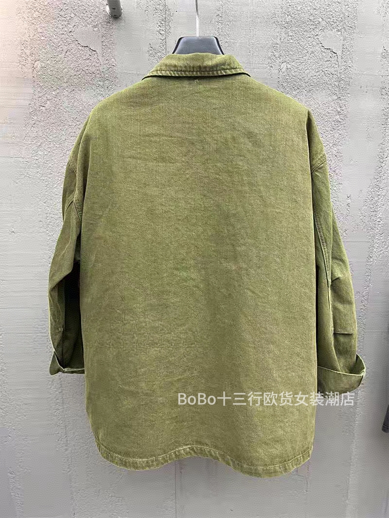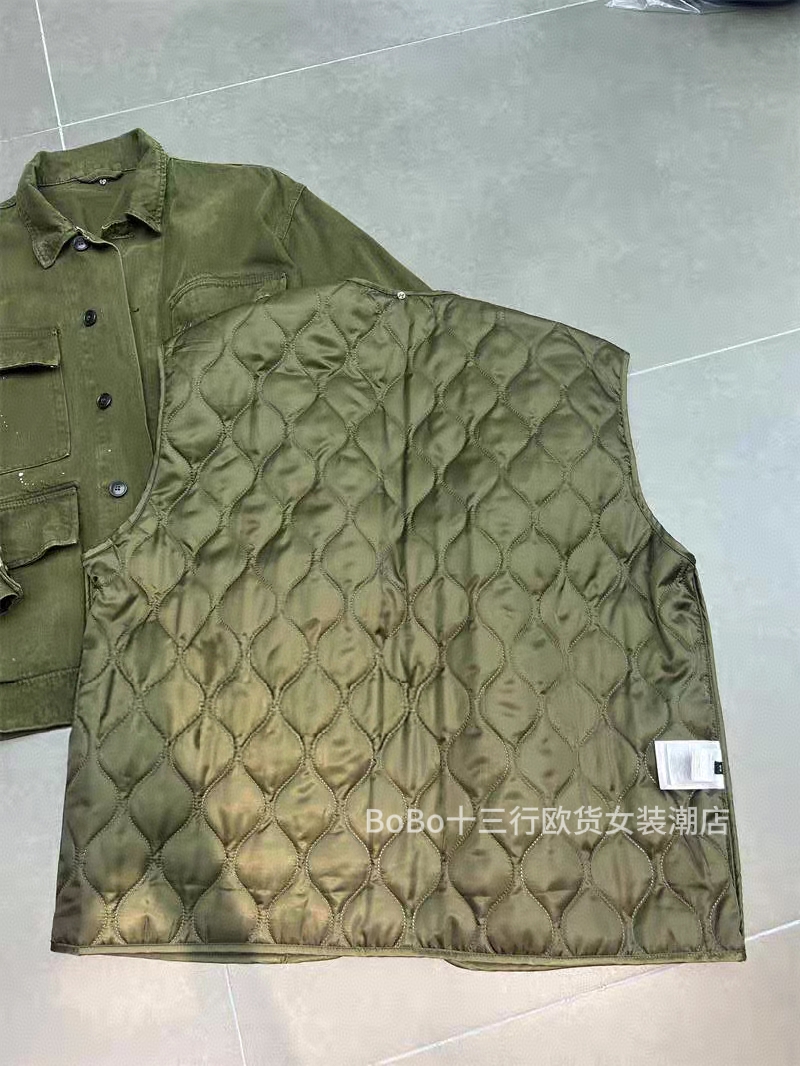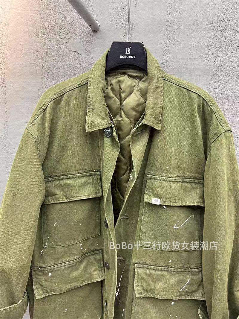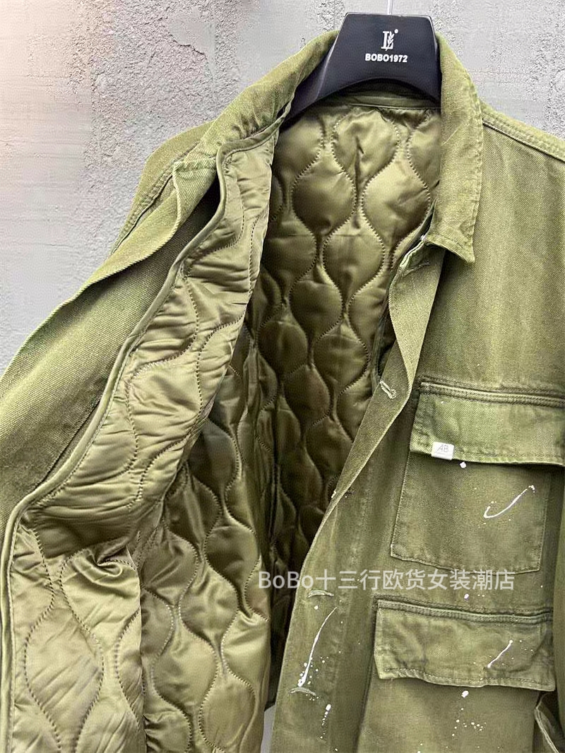 欧货bobo1972秋冬内胆棉可卸多口袋工装风衣中性翻领军绿夹克外套