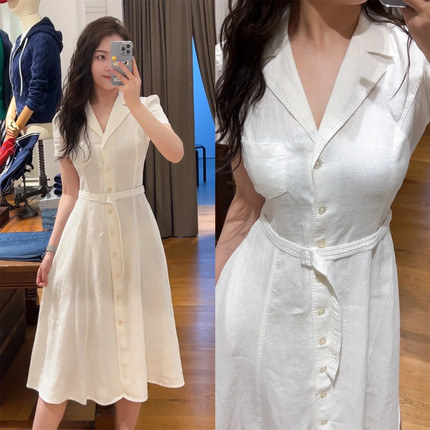 拉夫家2025夏季新款女装全亚麻衬衫连衣裙短袖中长裙系腰带显瘦