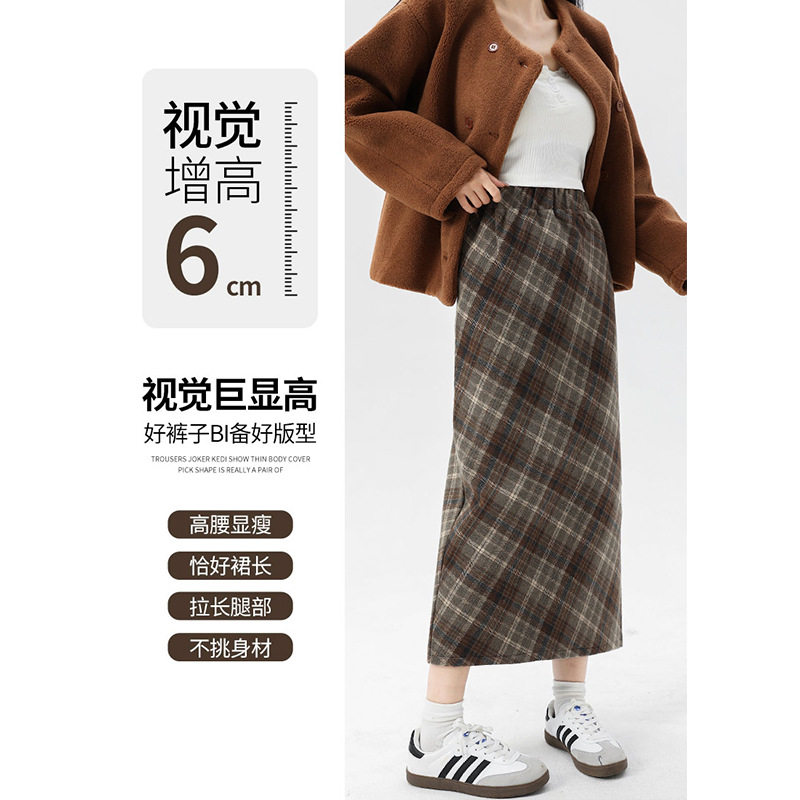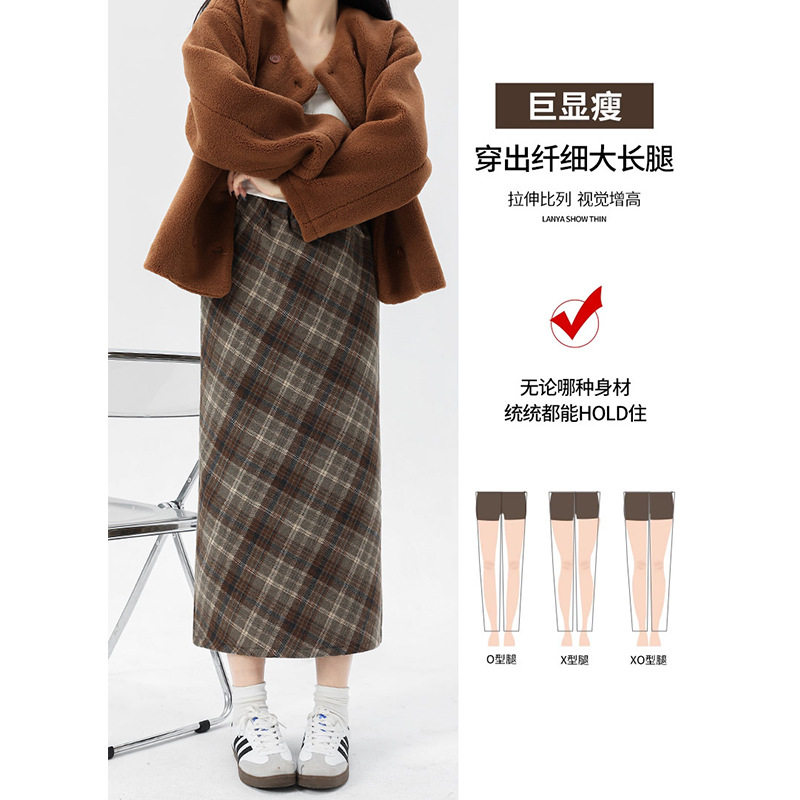 格子毛呢半身裙女秋季高腰复古包臀裙松紧腰高级感中长款a字裙