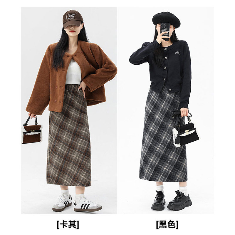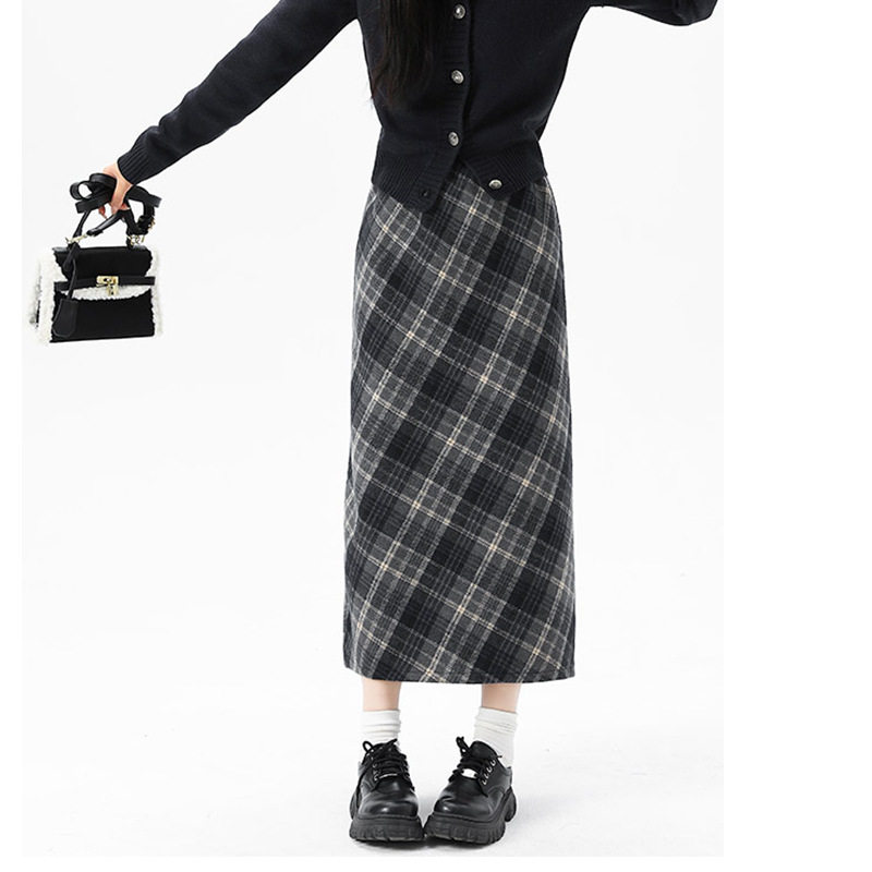 格子毛呢高腰复古半身裙