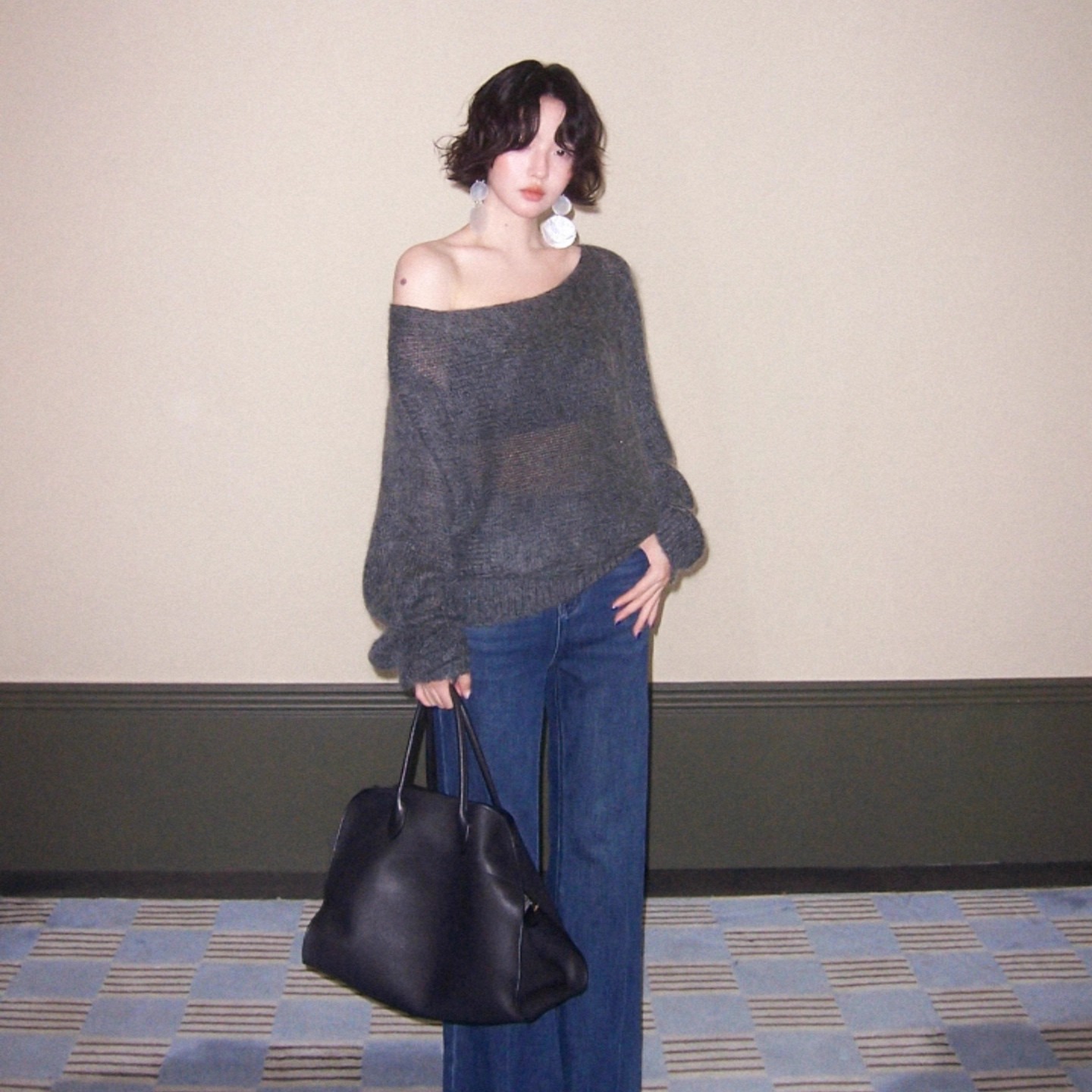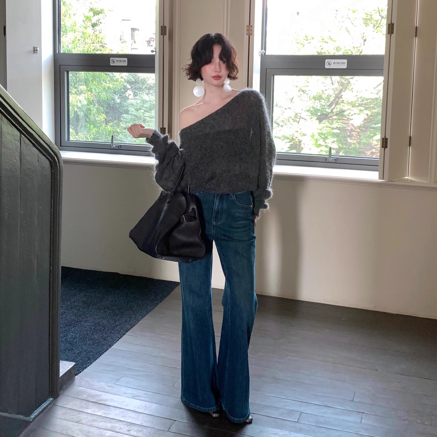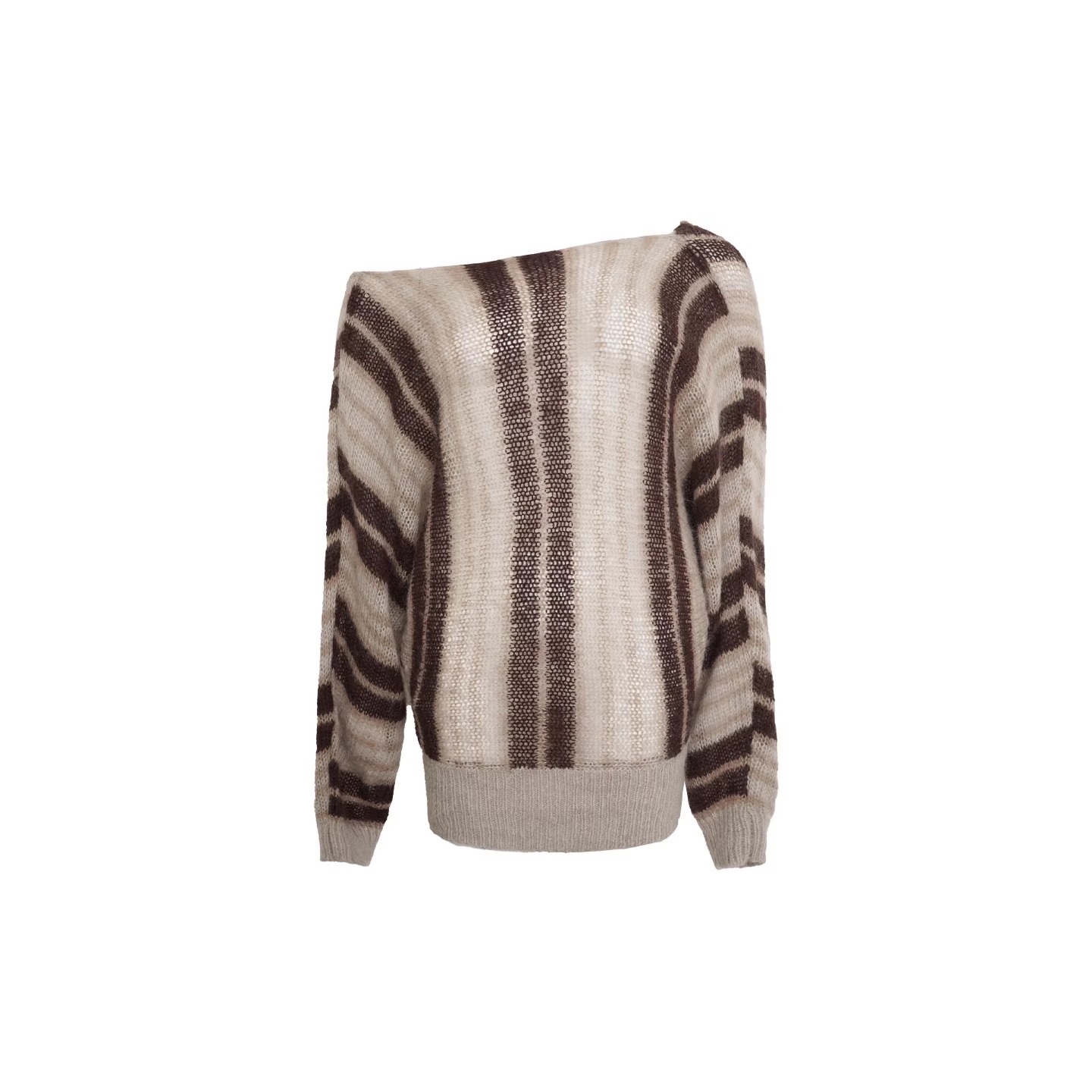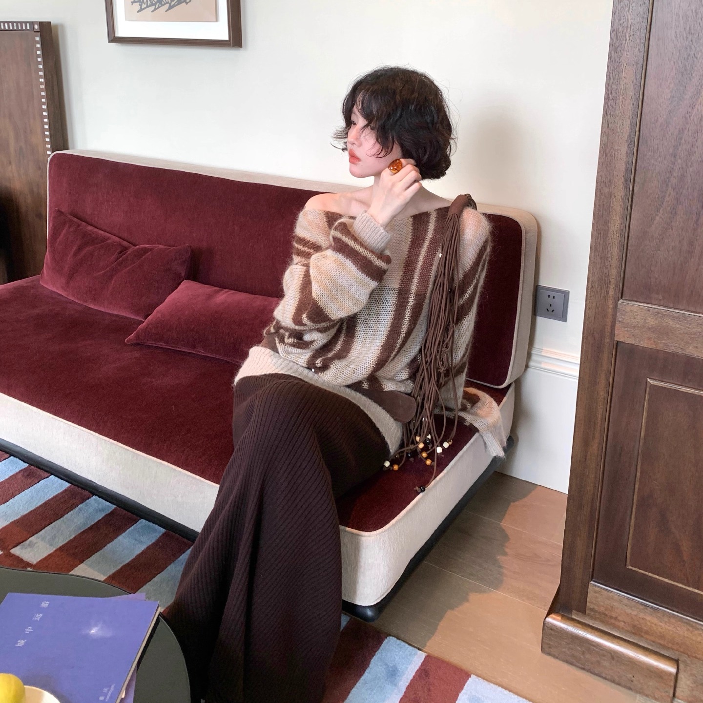 酒午港风复古秋季羊毛混纺慵懒感落肩宽松针织衫软糯条纹短款上衣