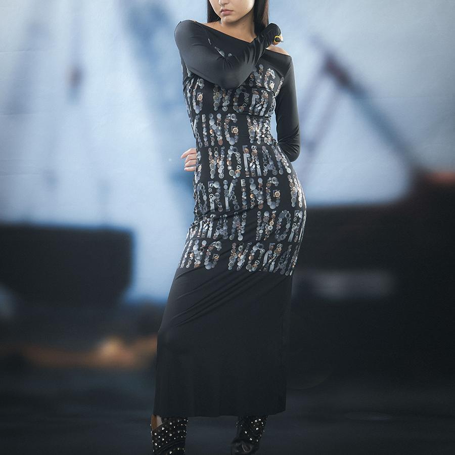 TROPICEYE 【售完无补】一字领长袖连衣裙修身弹性印花长裙