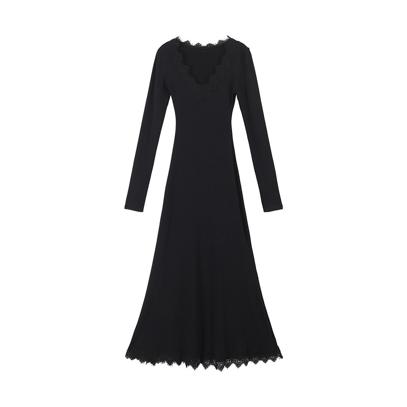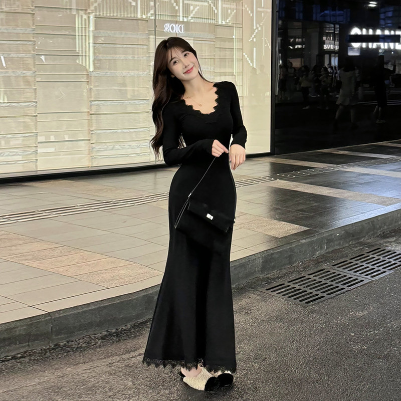 愉悦愉悦 黑色V领蕾丝长袖鱼尾连衣裙女秋冬收腰修身气质包臀长裙
