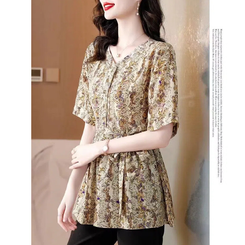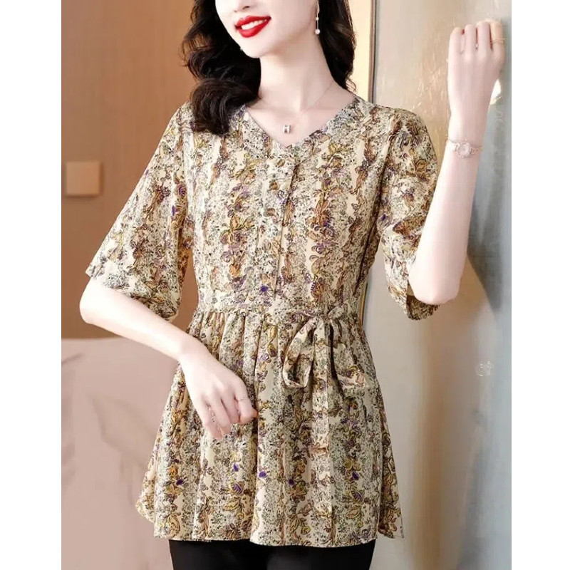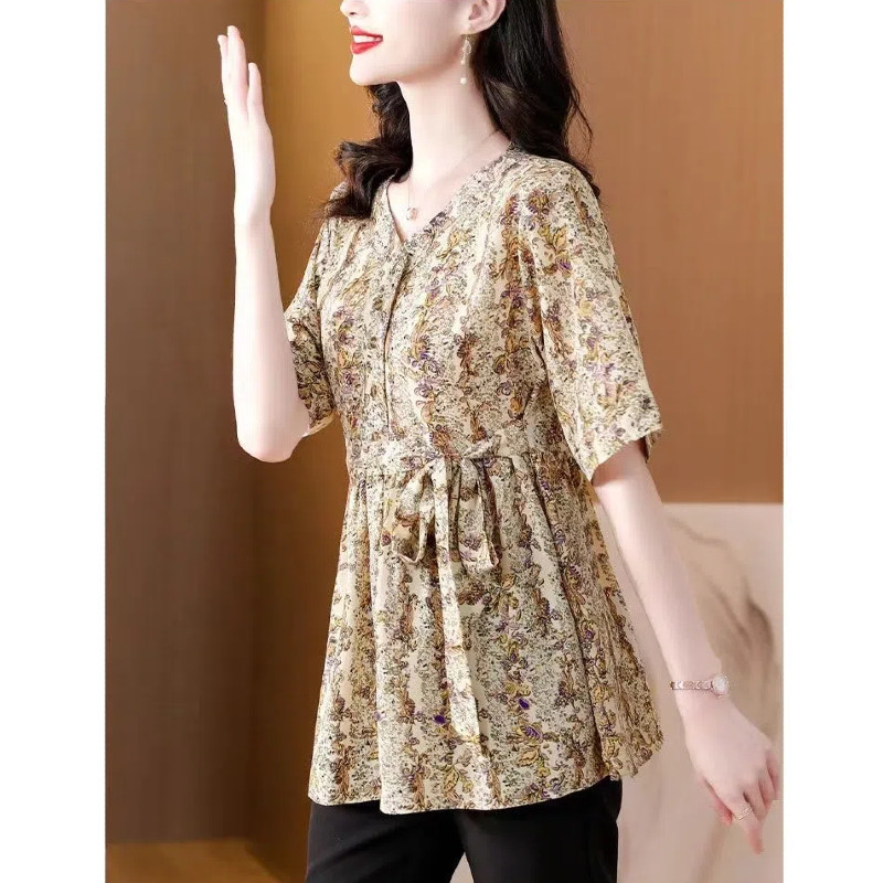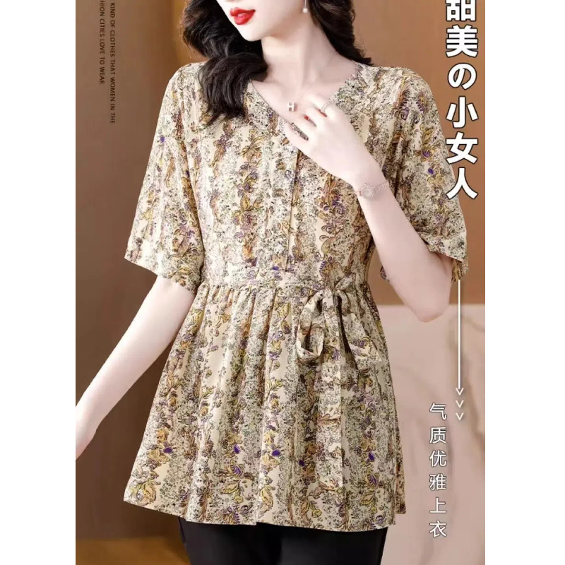 碎花雪纺衫女装中袖上衣2025新款夏季薄款大码妈妈装收腰显瘦小衫
