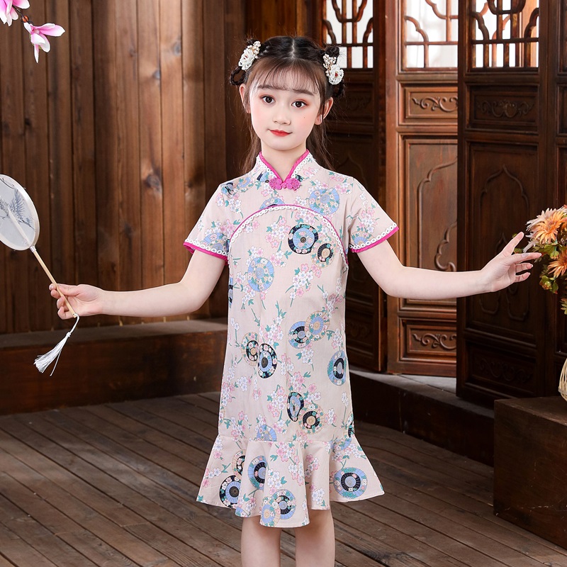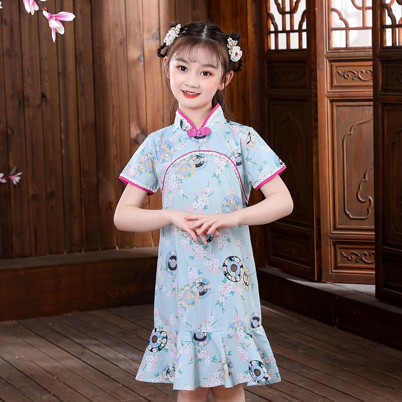 纯棉女童旗袍连衣裙新款夏装洋气中大儿童花布小女孩汉服公主裙子