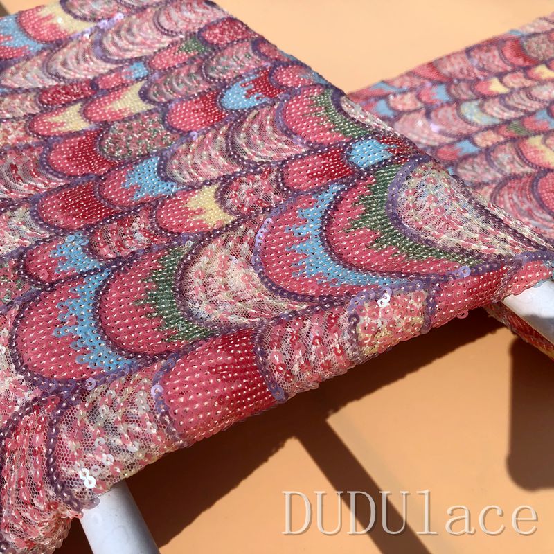 高端重工璃彩亮片刺绣蕾丝面料粉红色新娘礼服条纹旗袍敬酒服布料