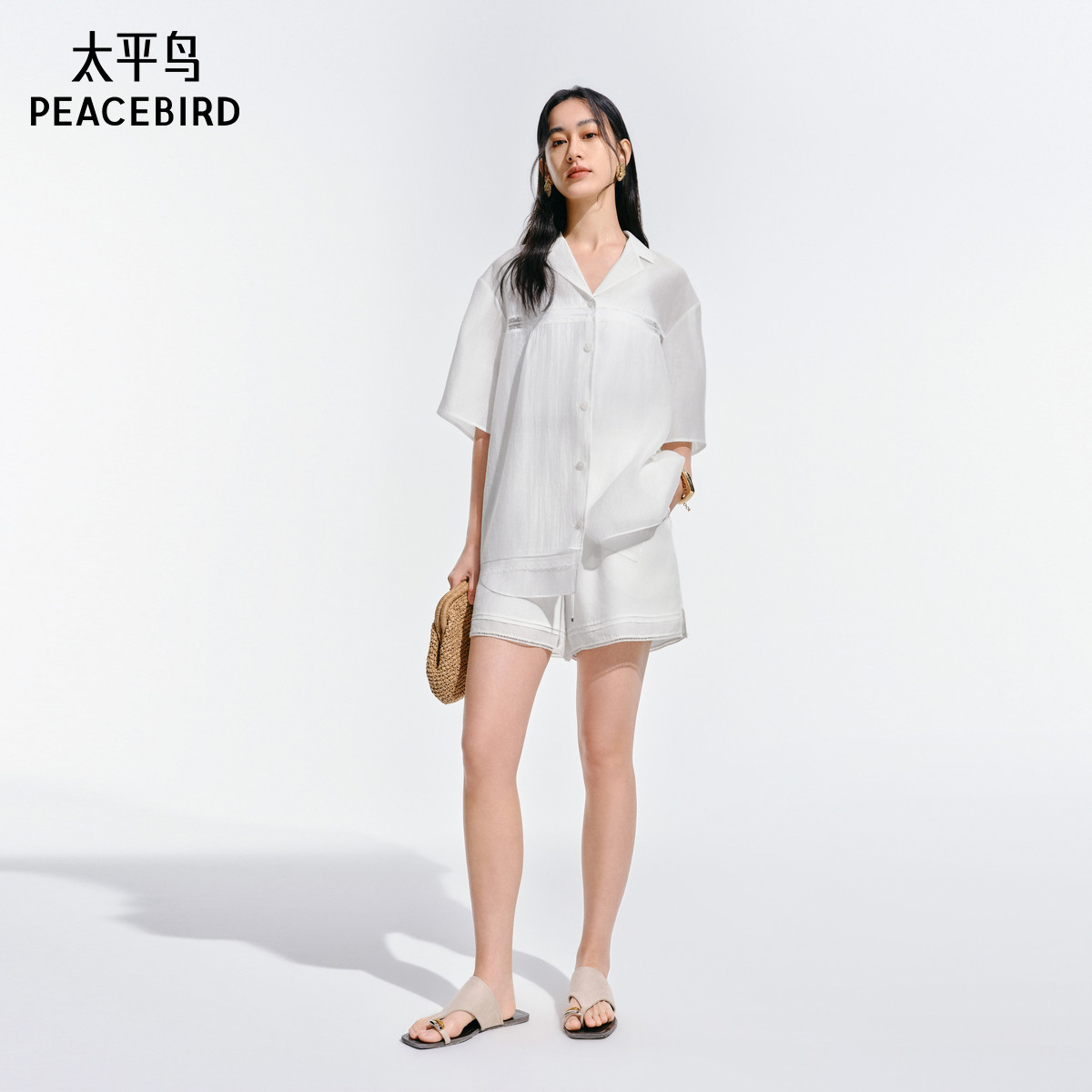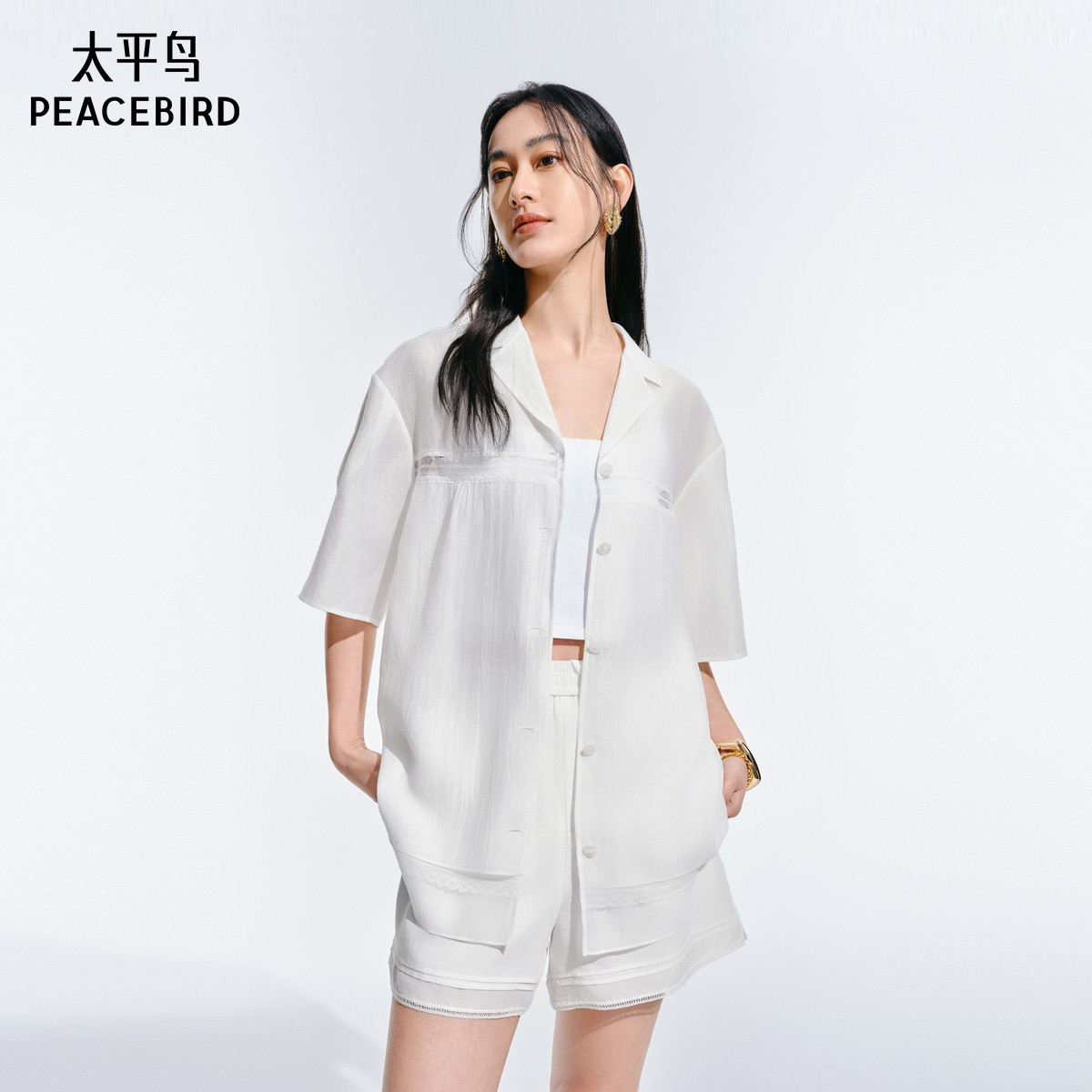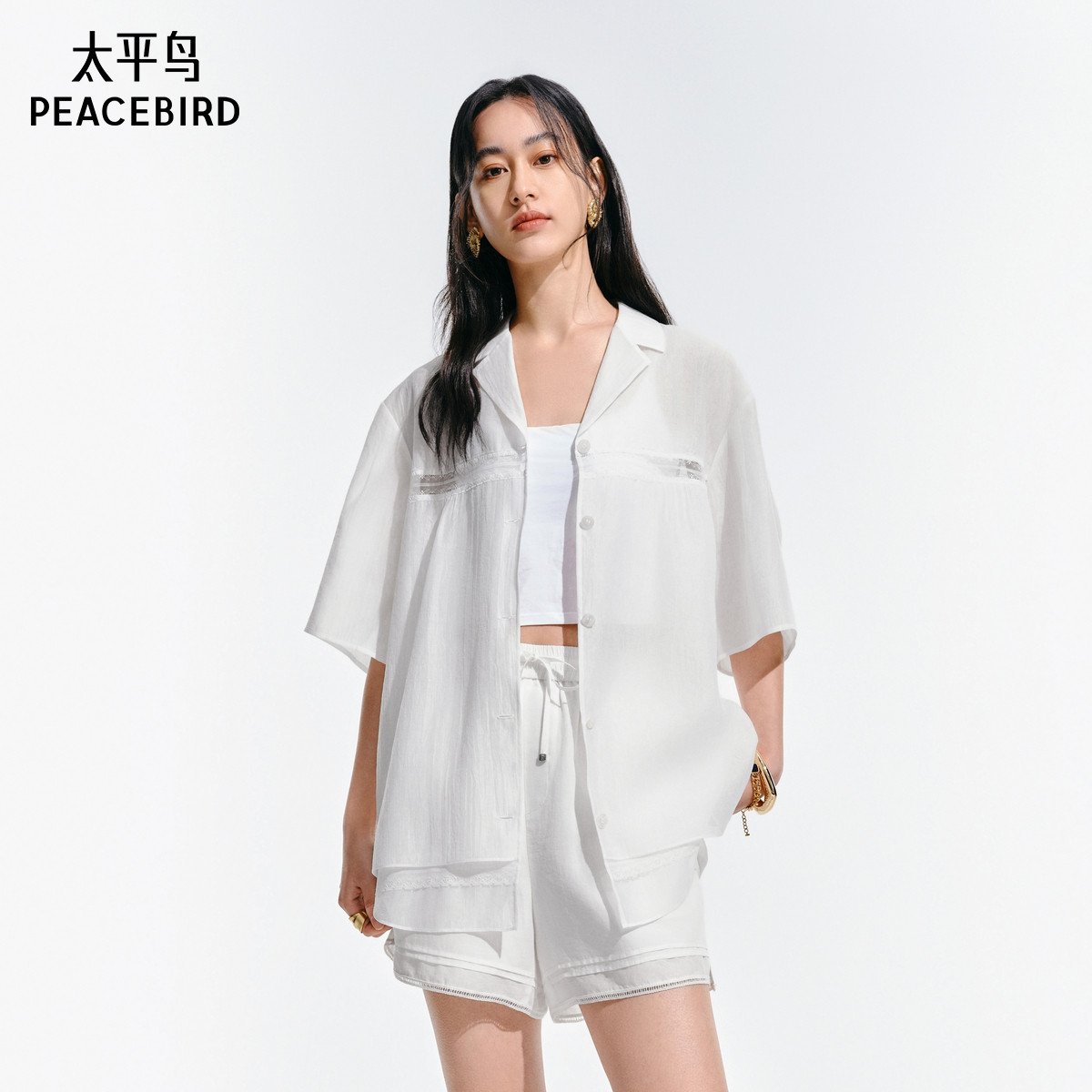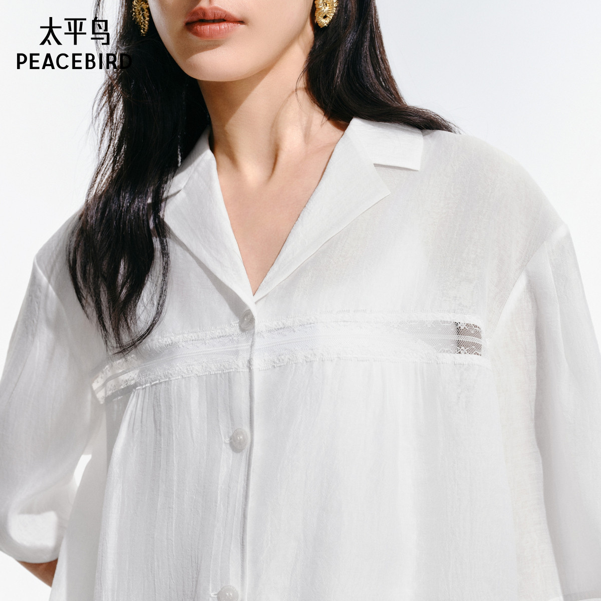 太平鸟仙气蕾丝边宽松短袖衬衫25夏季新款女士光泽感翻领轻薄上衣