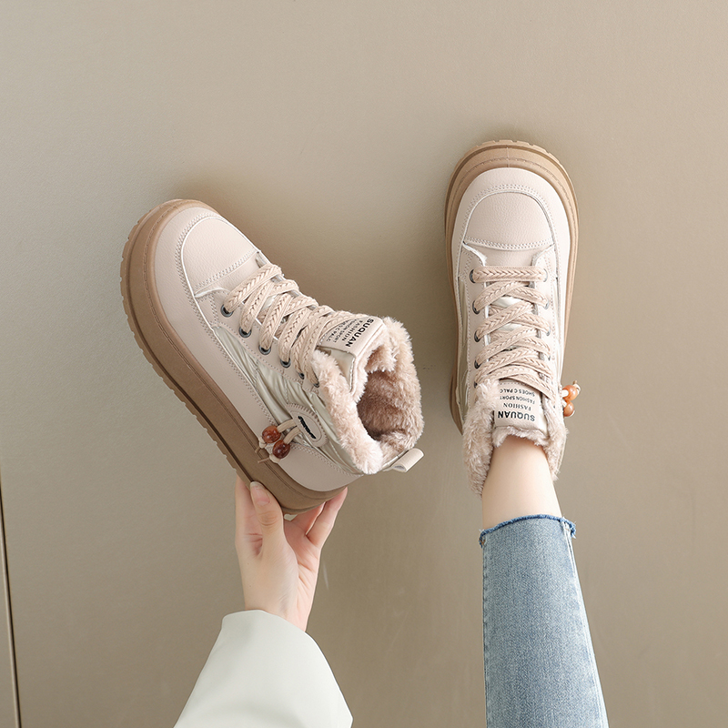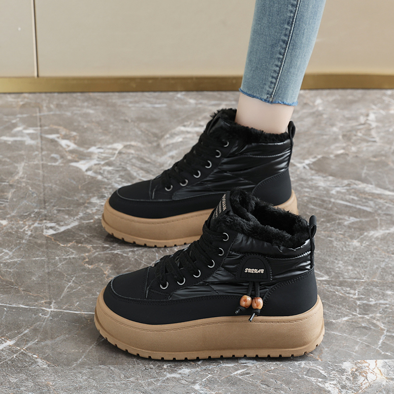 厚底系带大棉鞋女2025新款冬季加绒保暖短靴皮面防水高帮休闲板鞋