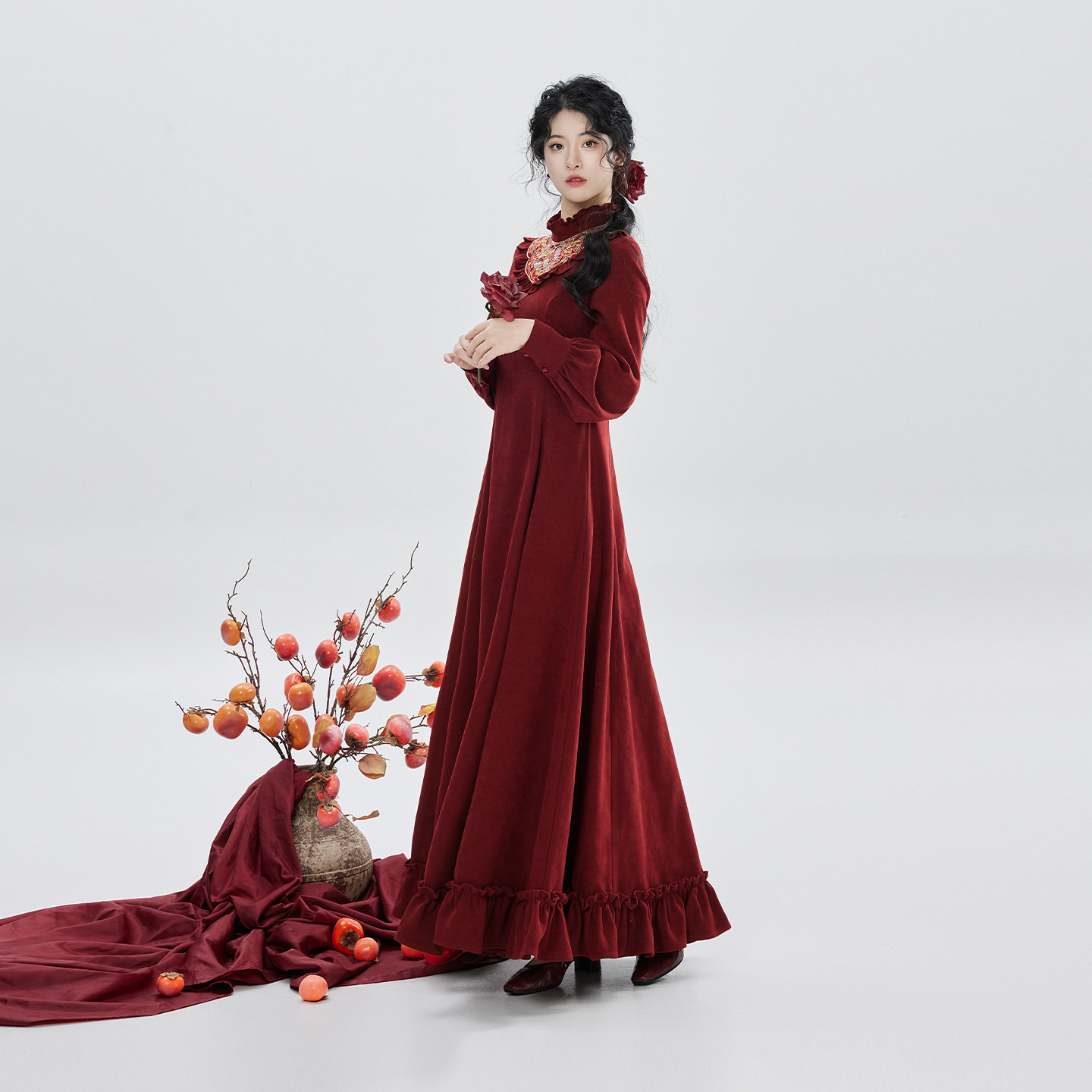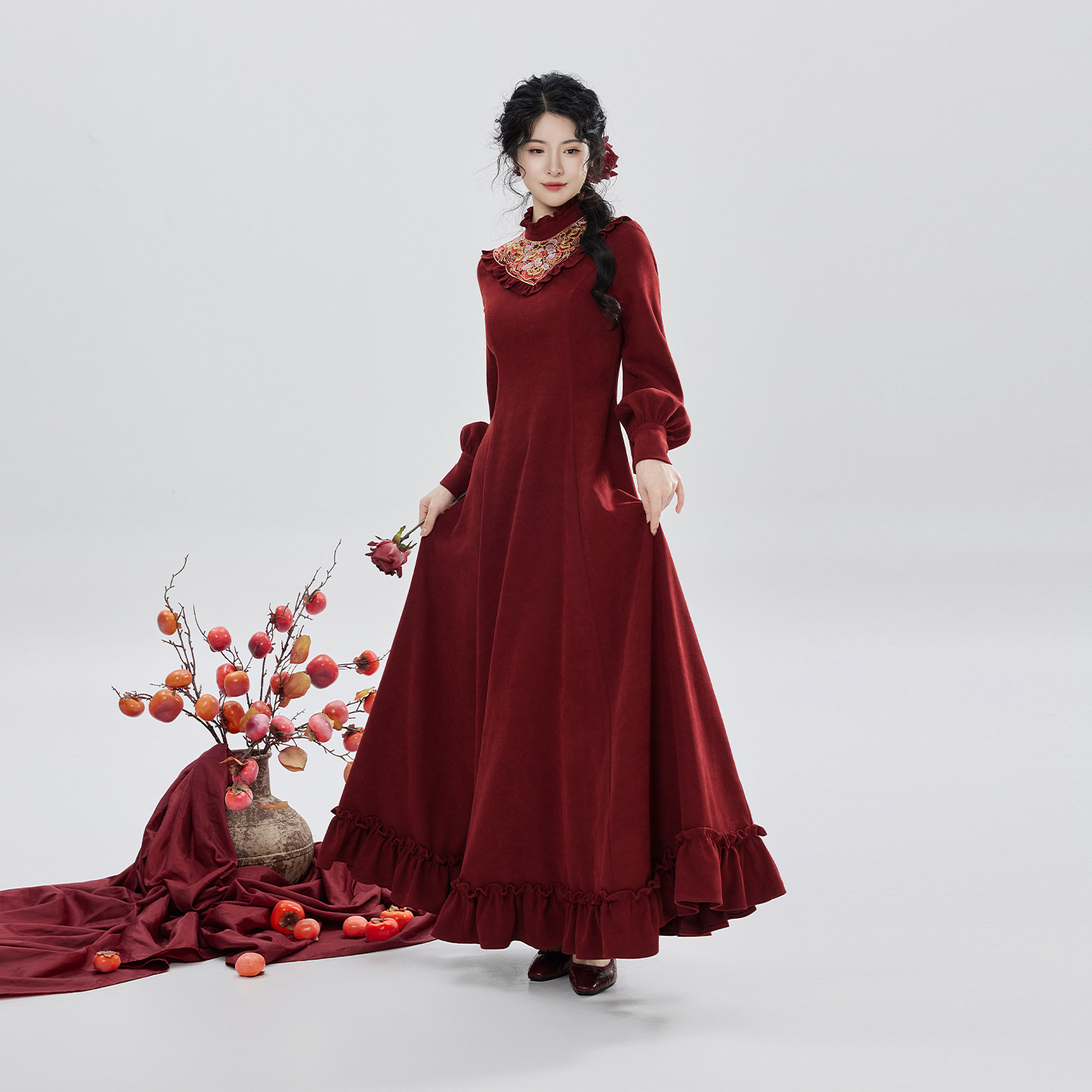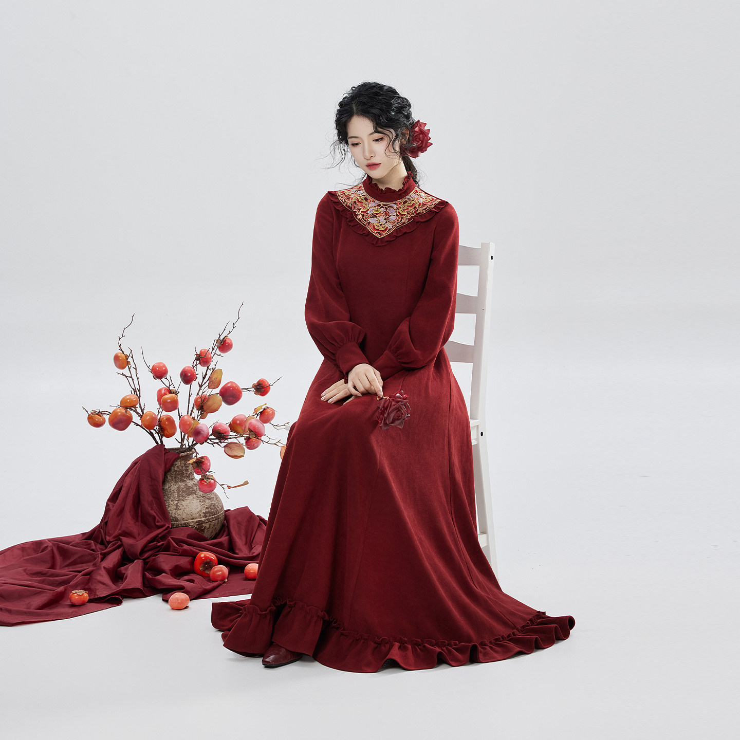 织造司[冬柿]红色新年战袍绣花呢子长袖连衣裙女冬新中式国风长裙