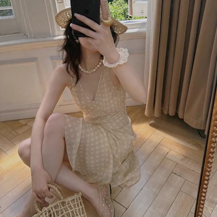 TOP家 仲夏波尔卡 法式复古波点 优雅曲线奶酪色系真丝无袖连衣裙