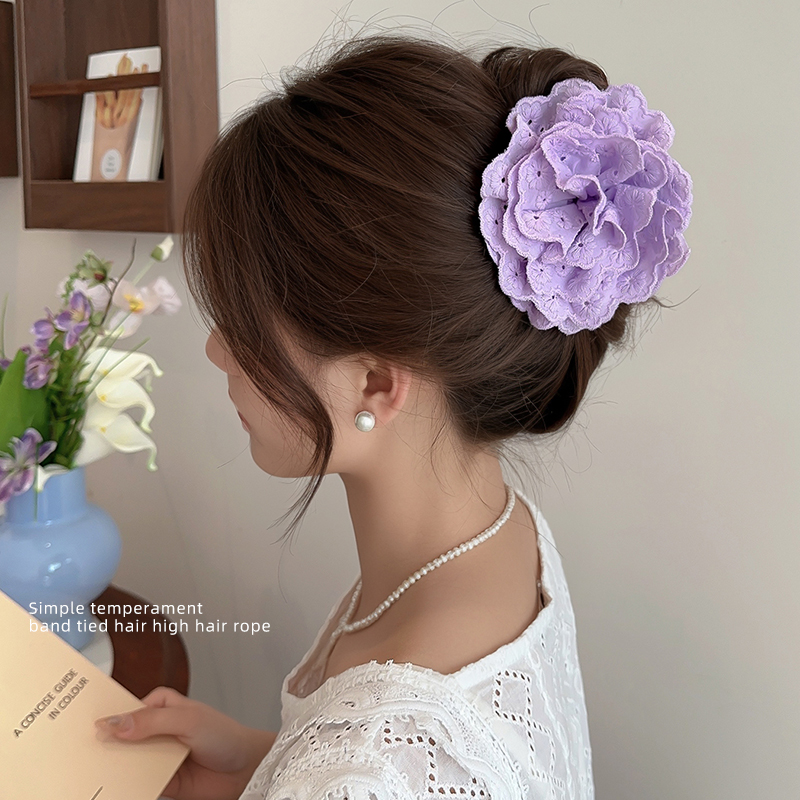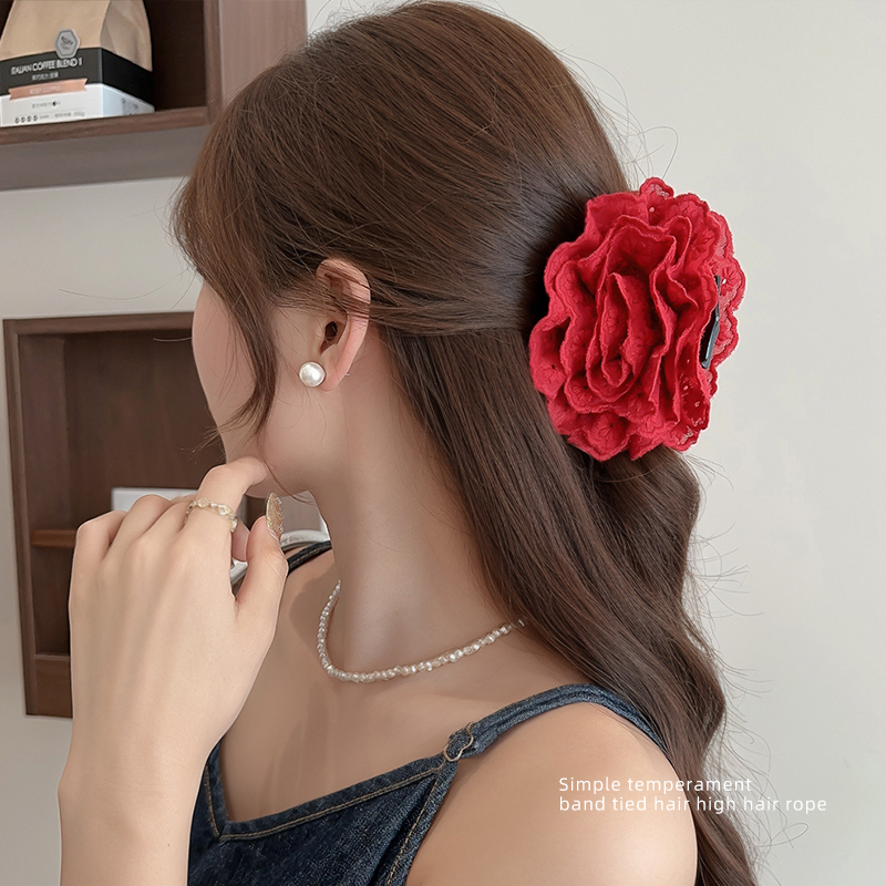 高级感蕾丝花朵发夹女后脑勺2025新款高端抓夹红色头花鲨鱼夹头饰