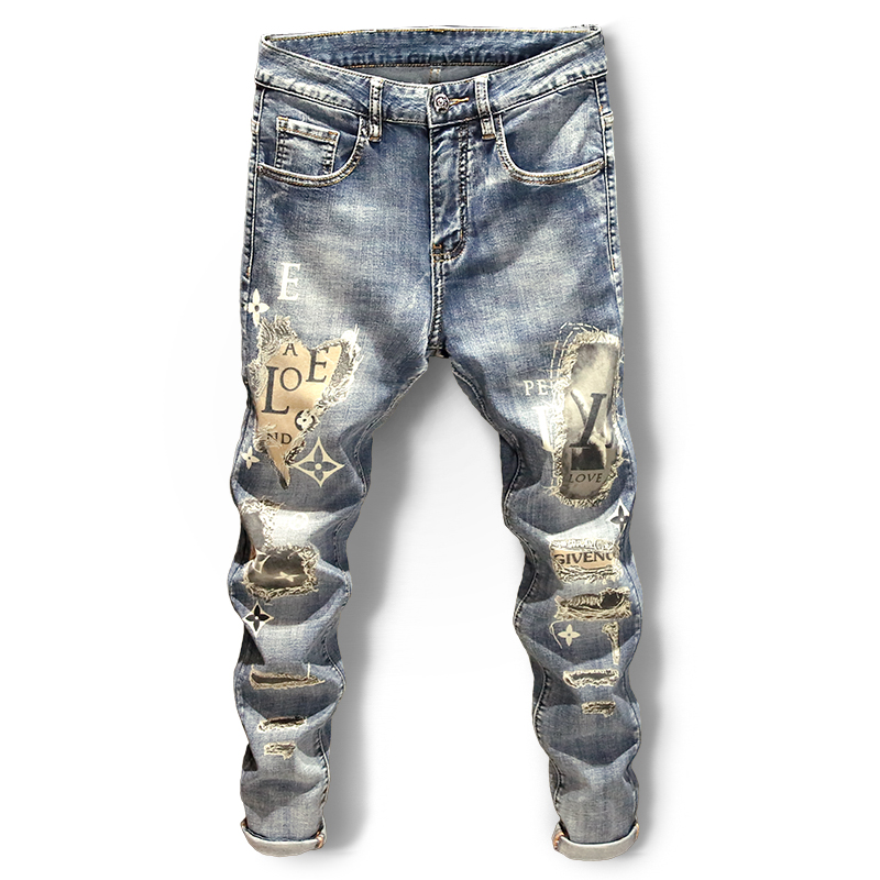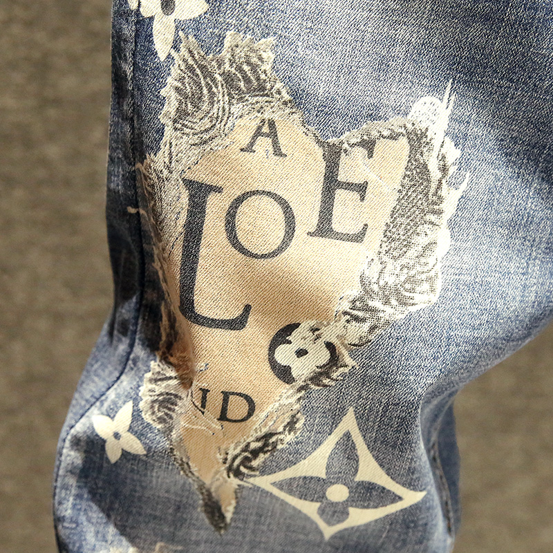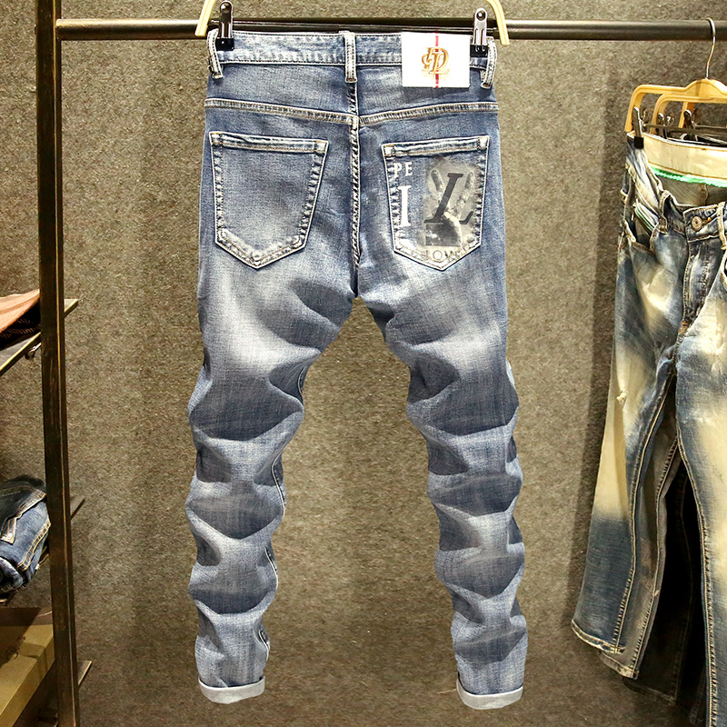 高端刺绣牛仔裤男印花潮牌修身小脚裤春季韩版潮流男装时尚长裤子