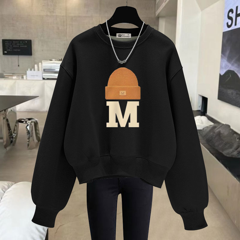 设计感字母圆领短款卫衣女2025春秋冬宽松慵懒风加绒加厚套头长袖