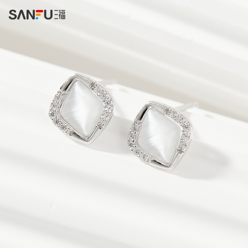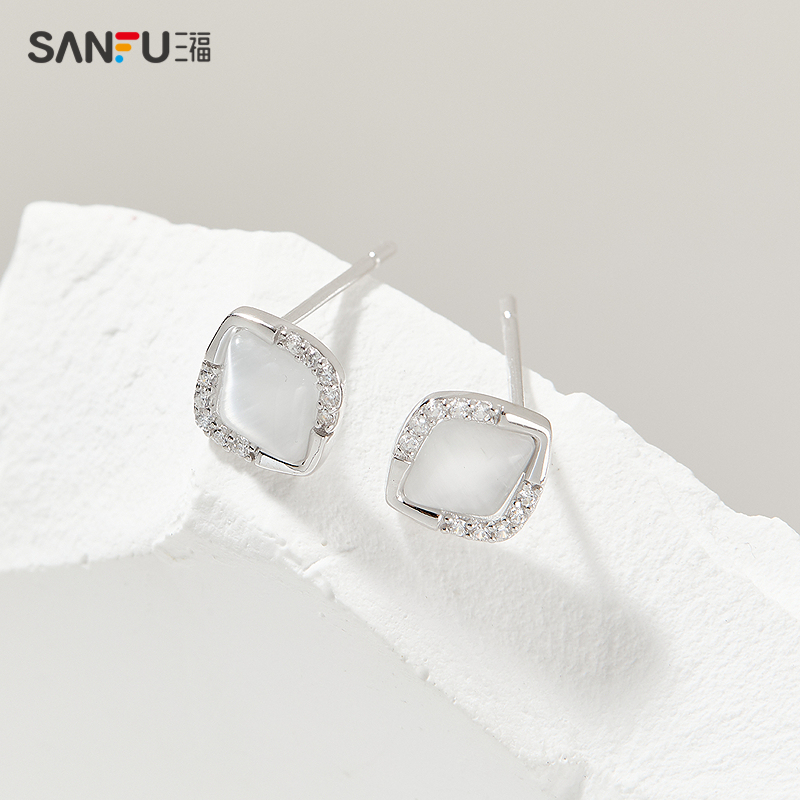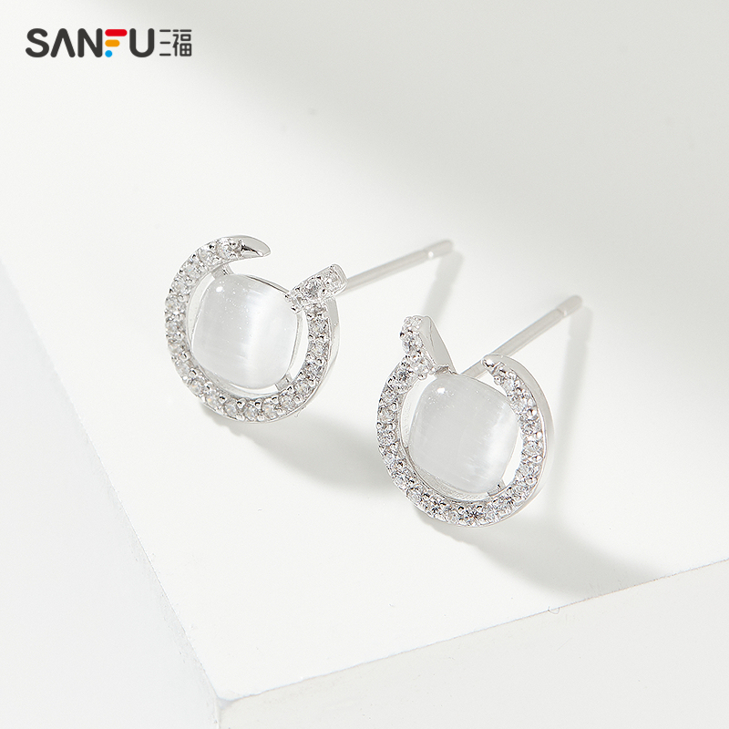 三福925银镶嵌猫眼耳钉一对 气质时尚首饰耳饰耳环 840847