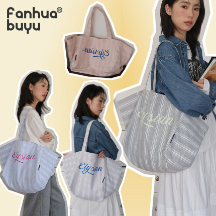 梵花不语条纹帆布包女2025新款大容量托特包韩系慵懒风拉链单肩包
