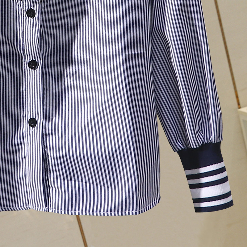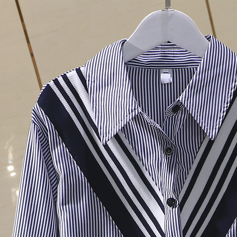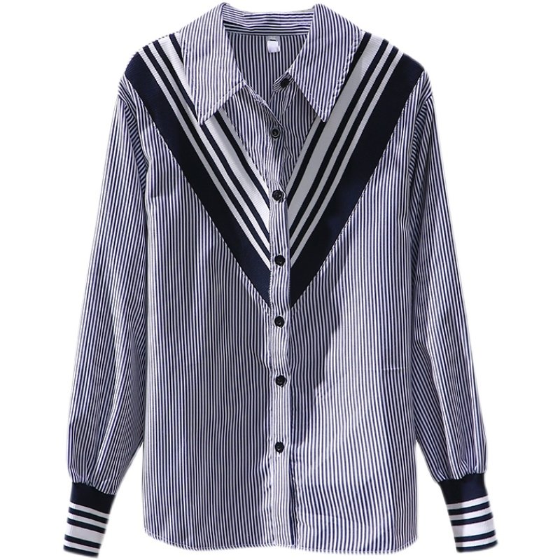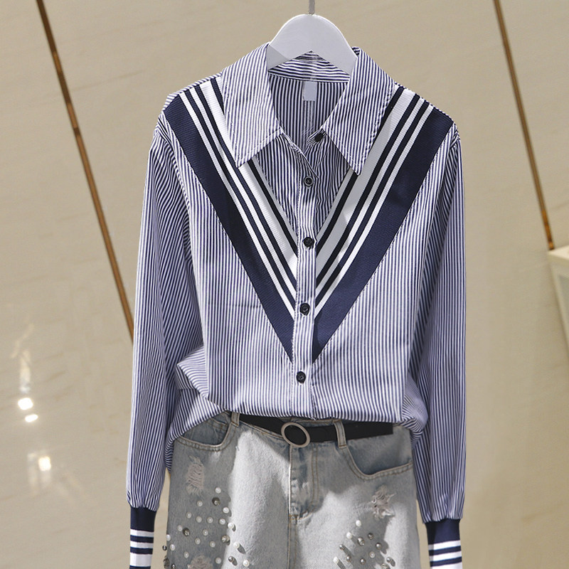 2025春季新款条纹拼色洋气衬衣气质百搭POLO领长袖衬衫外穿打底女