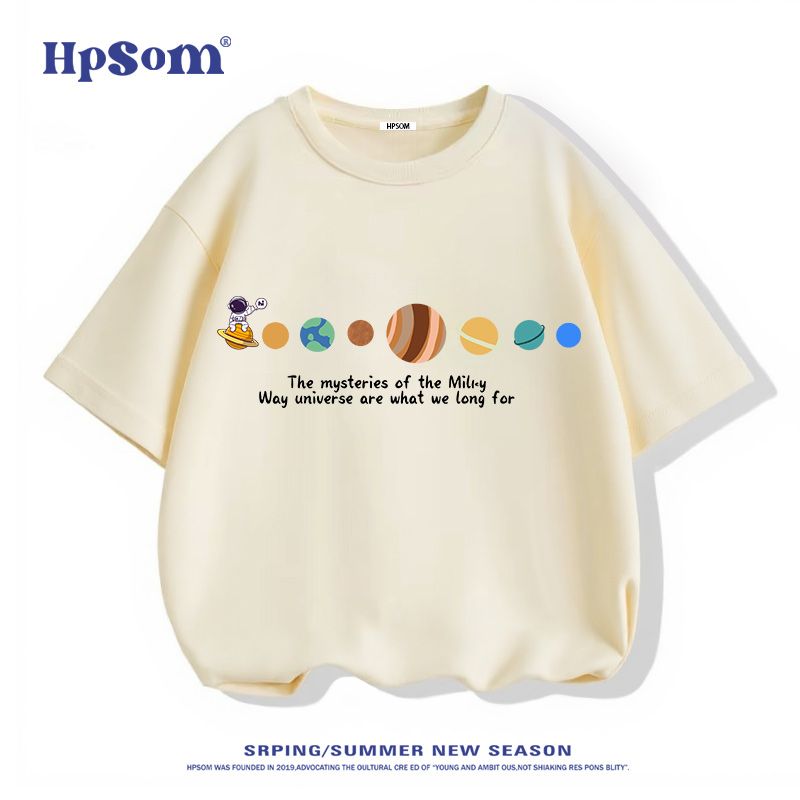 儿童黄蓝条纹纯棉短袖T恤2025新款行星印花男女童时尚潮流上衣夏
