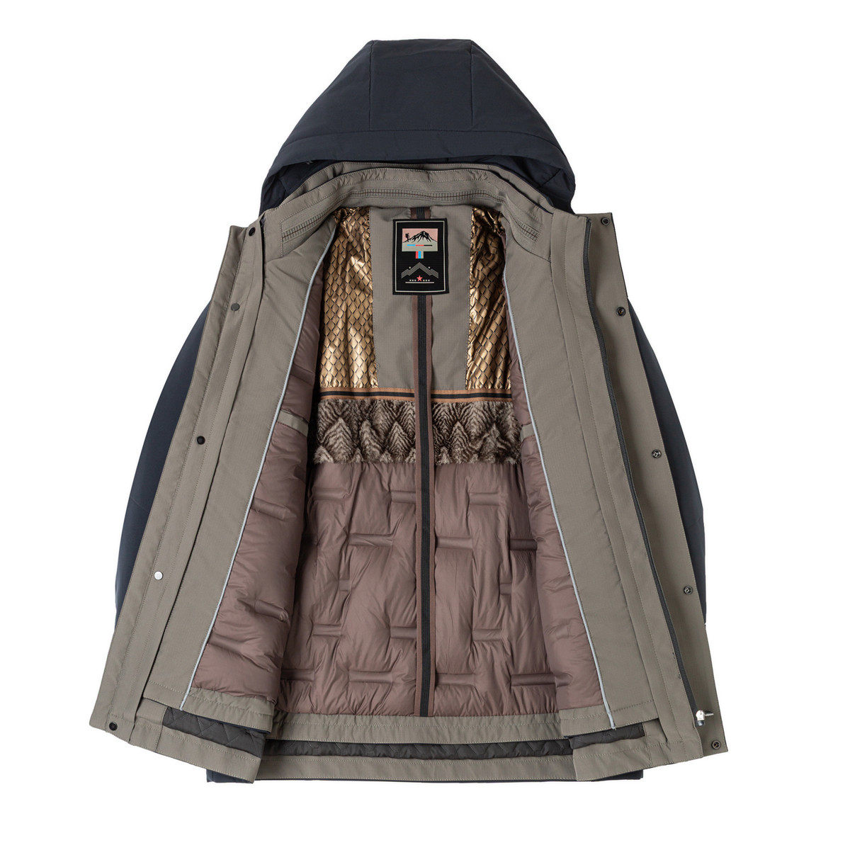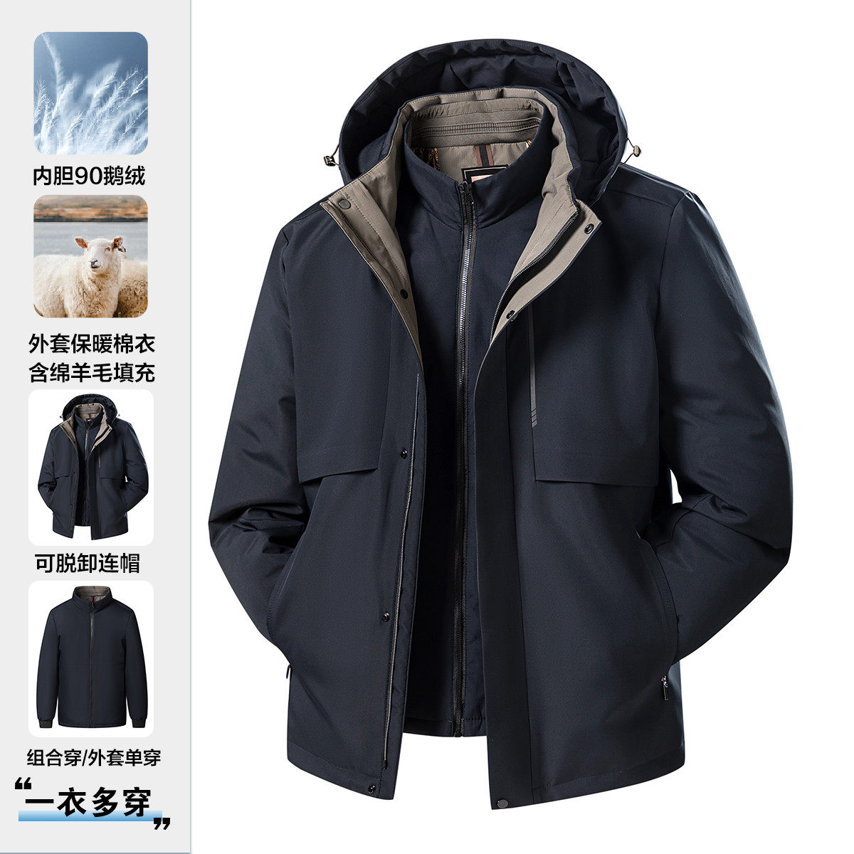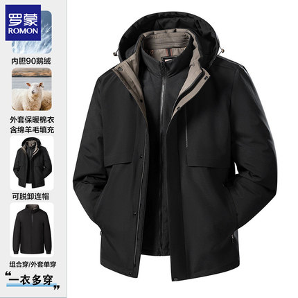罗蒙冬男士可脱卸90鹅绒兔毛皮内胆可拆连帽羽绒服含羊毛夹棉外套