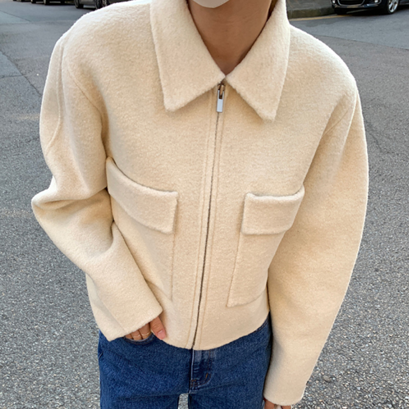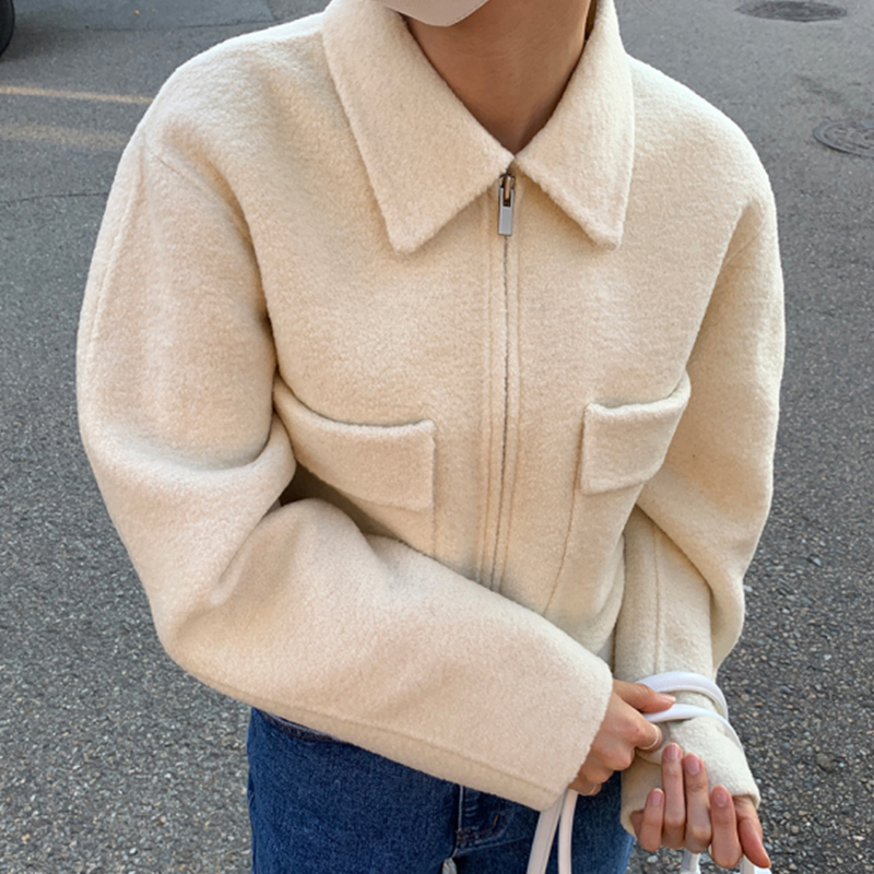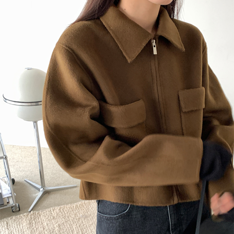 韩国chic秋冬复古洋气翻领拉链式双口袋宽松百搭长袖短款毛呢外套