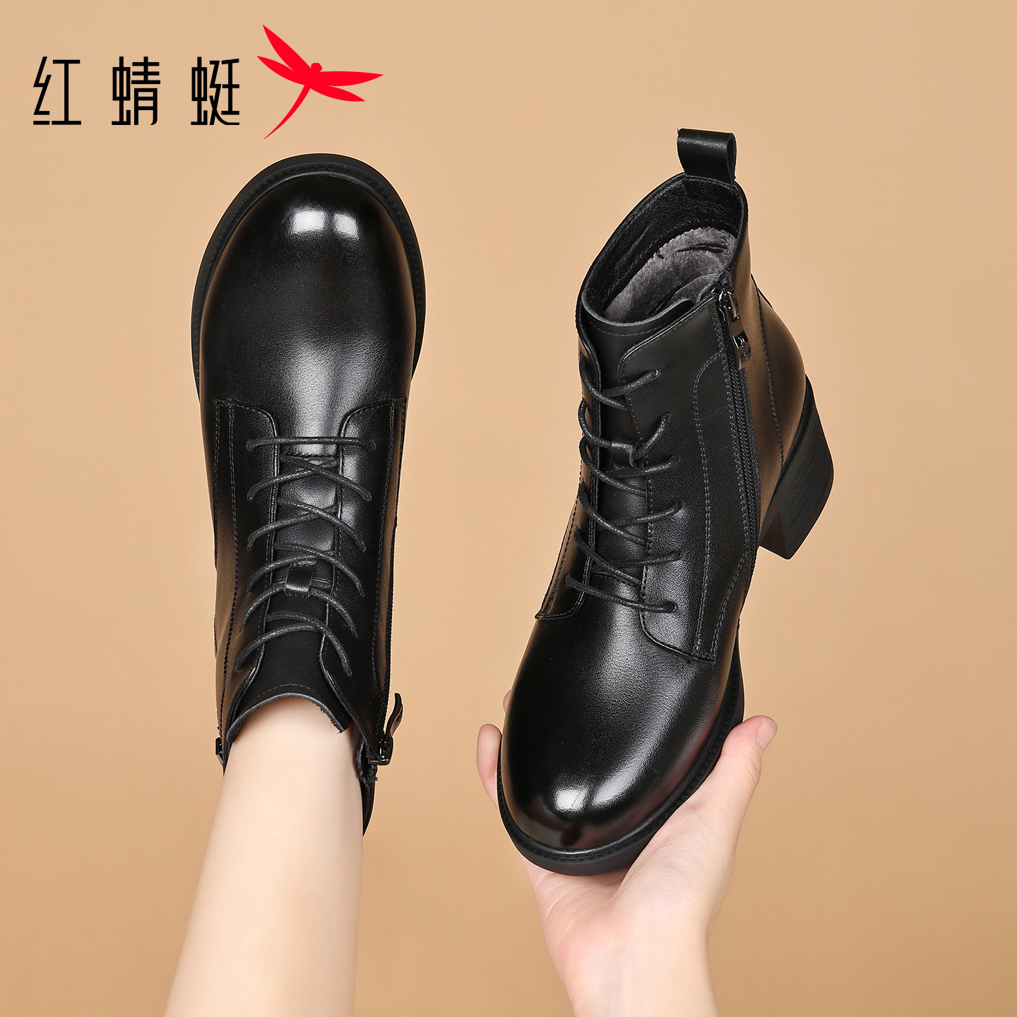 红蜻蜓女鞋秋冬季靴子高跟马丁靴女款新款真皮加绒短靴英伦风皮靴