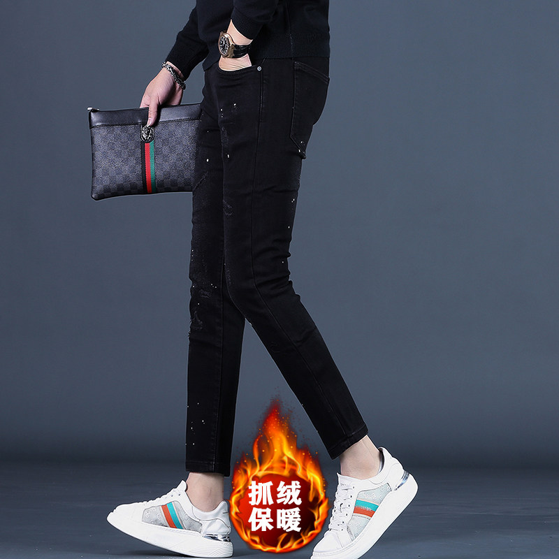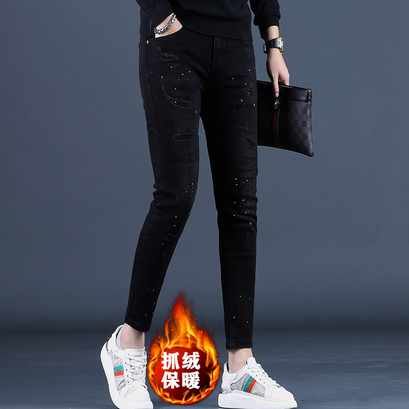 2025秋冬季新款黑色破洞抓绒牛仔裤男潮修身潮流九分小脚裤子韩版