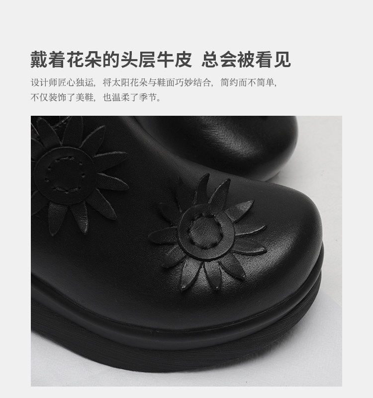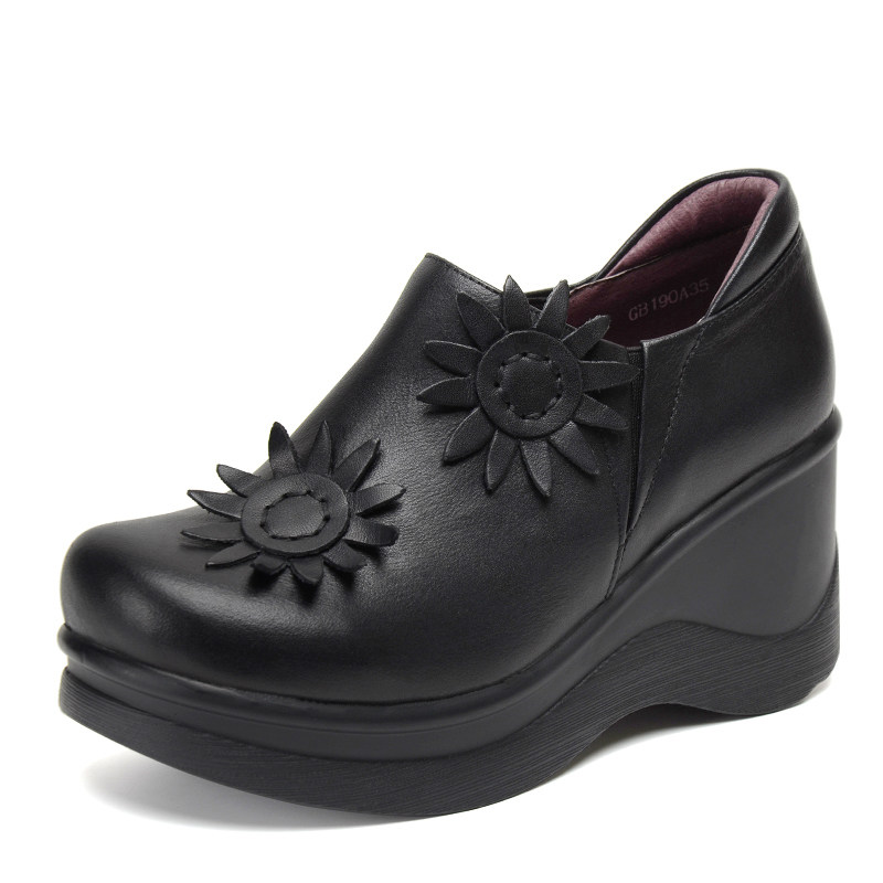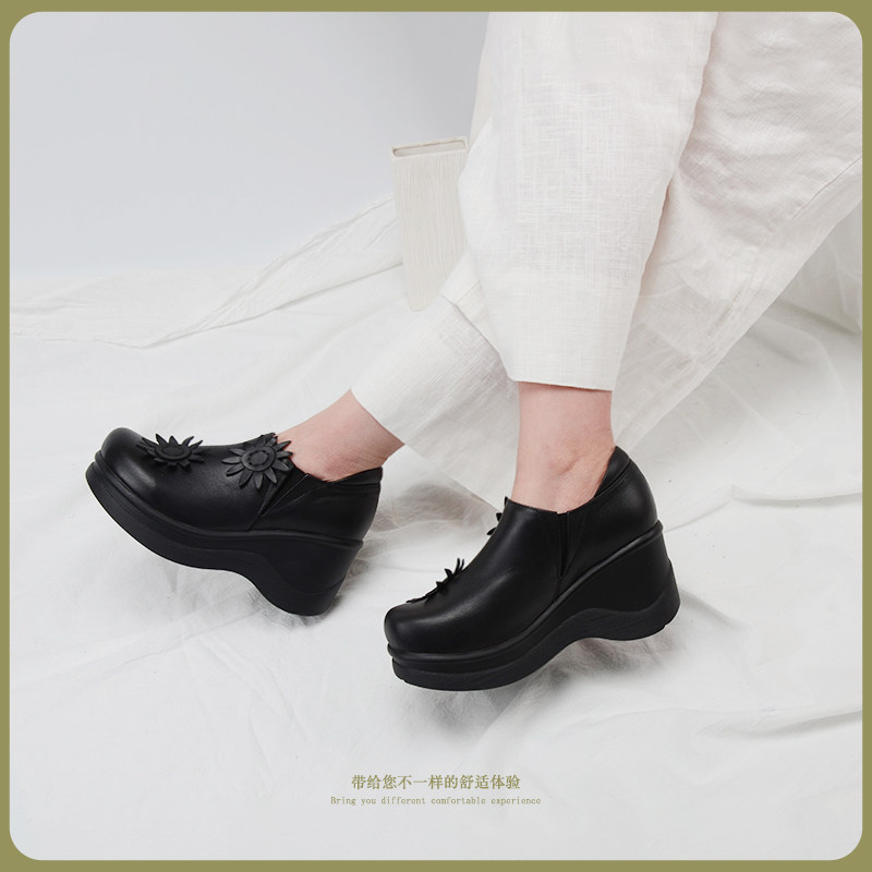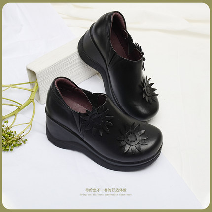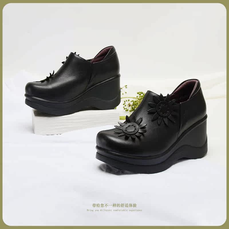 一席之地中年女鞋坡跟真皮厚底舒适妈妈鞋大码单鞋中老年女皮鞋