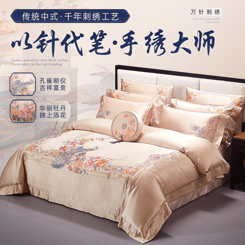 思辰家纺140支新中式结婚四件套高端全棉金色婚庆喜被新婚礼床品