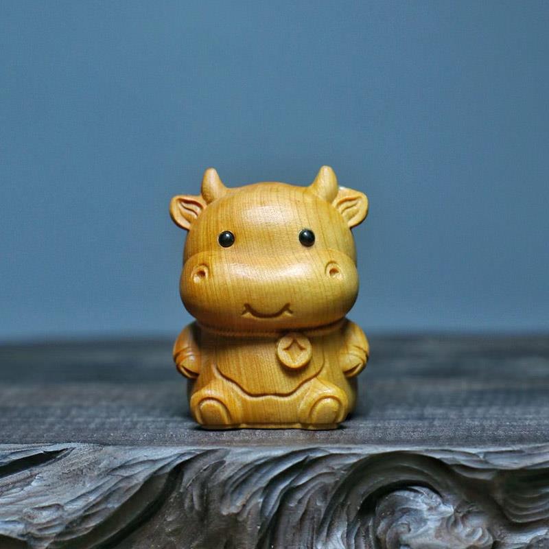 崖柏木生肖牛小摆件原木雕刻小牛把件牛气哄哄可爱萌宠实木手把件