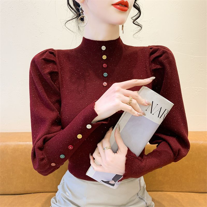 时尚灯笼袖半高领针织打底衫女秋冬新款修身内搭加厚保暖毛衣长袖