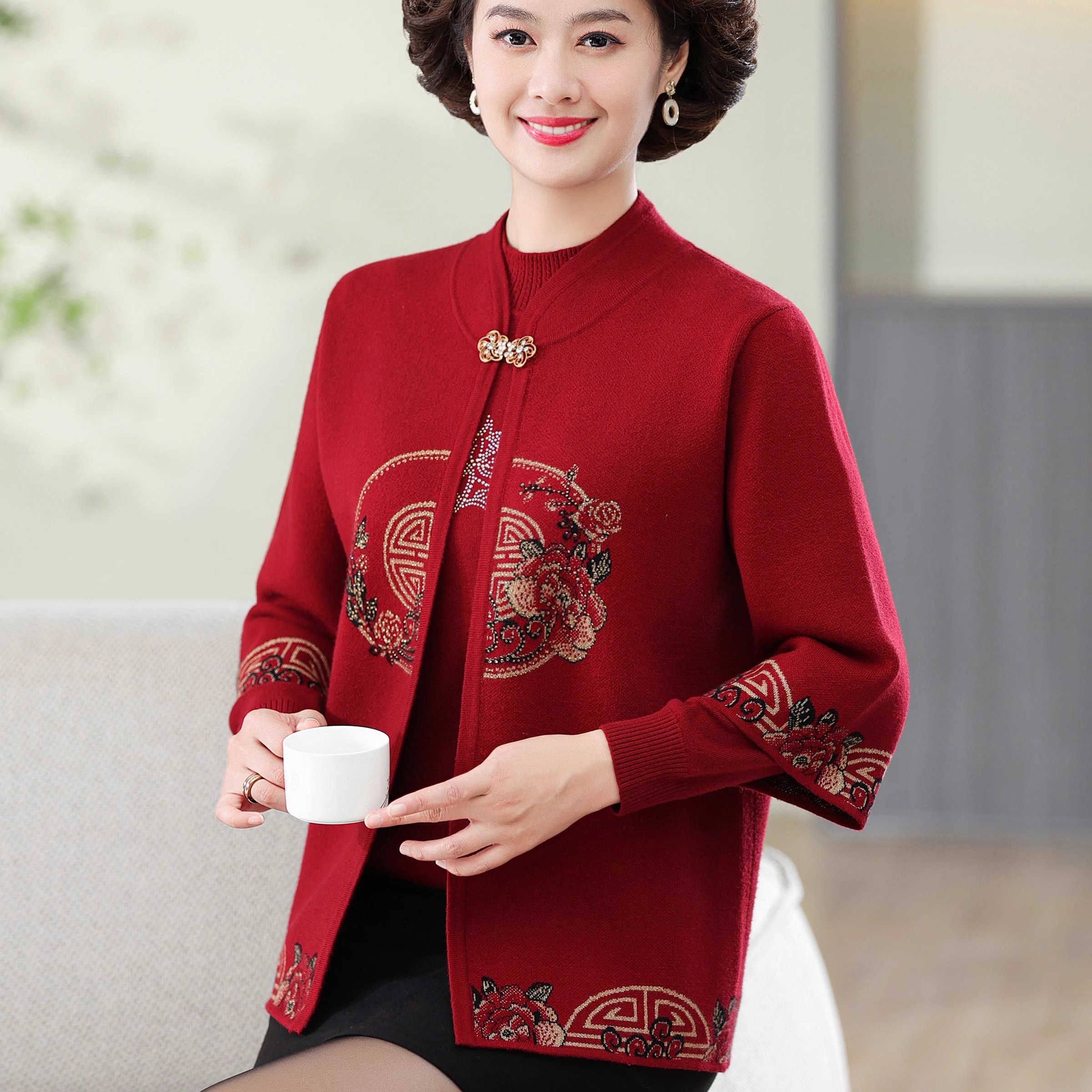 中老年女装秋冬长袖针织洋气套装中老年半高领国风外套上衣两件套