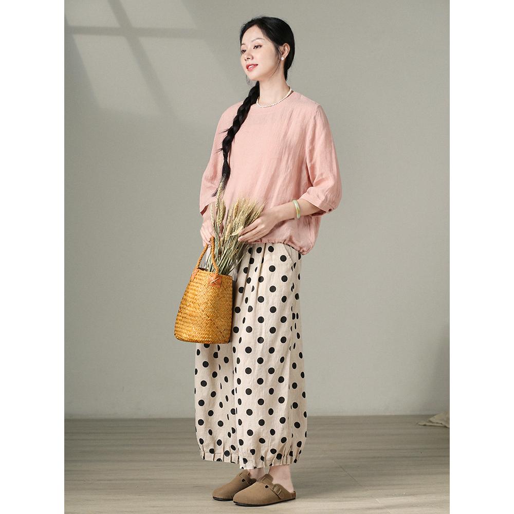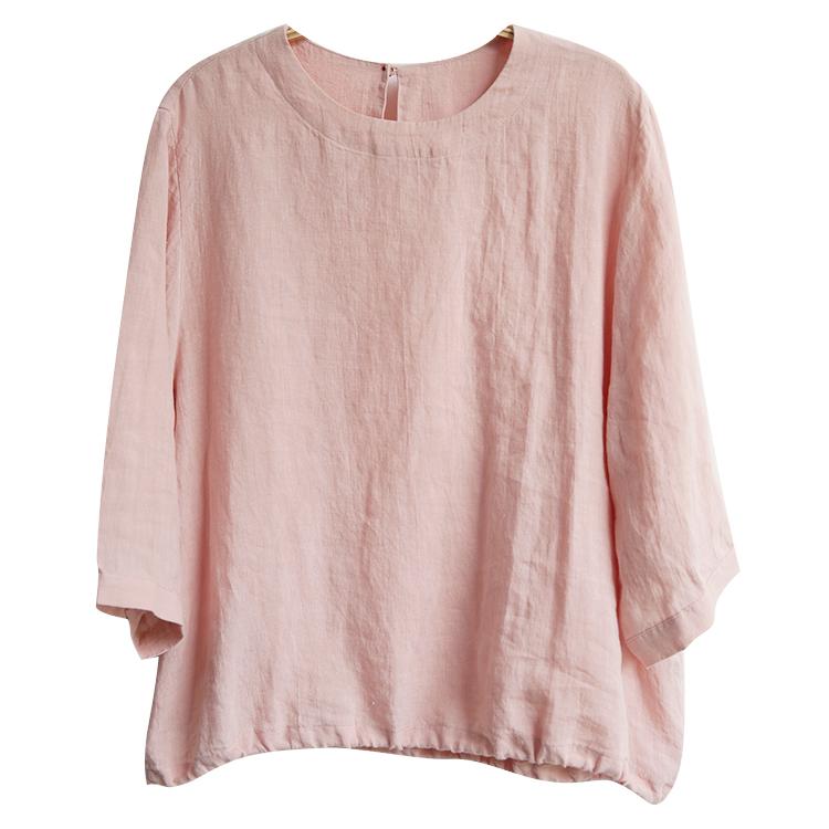谷家 100%亚麻收腰显瘦套头衬衫女七分袖 夏季新款圆领防晒T恤衫