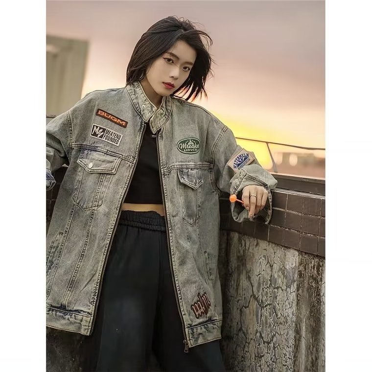 美式复古牛仔外套男女2023水洗做旧工装夹克vintage立 领机车服潮