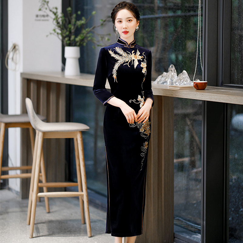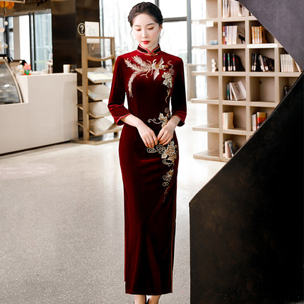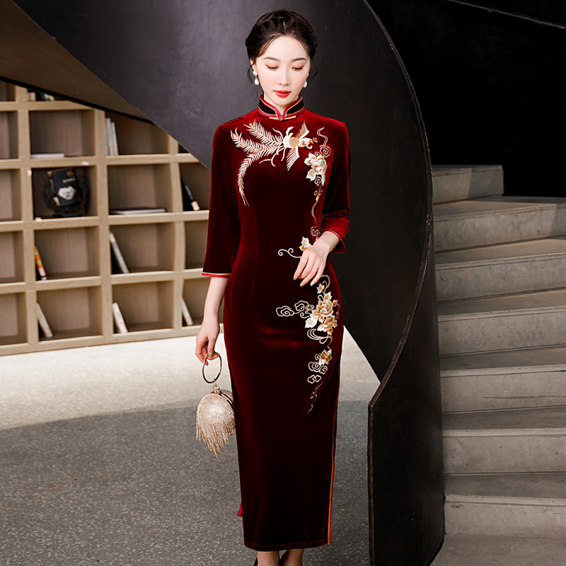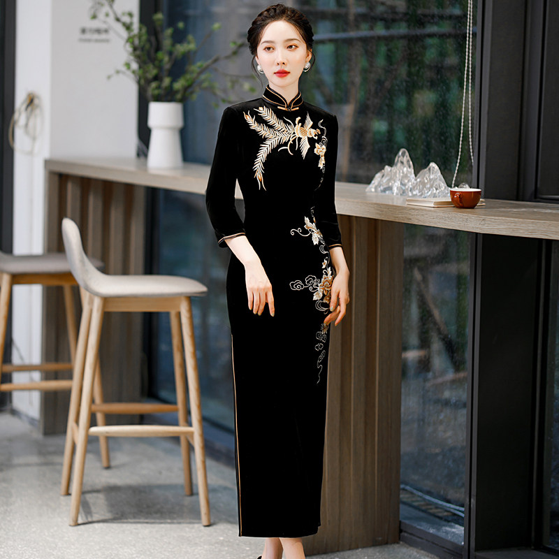 金丝绒长款刺绣旗袍日常气质优雅