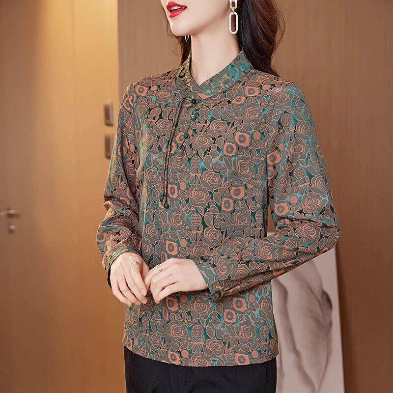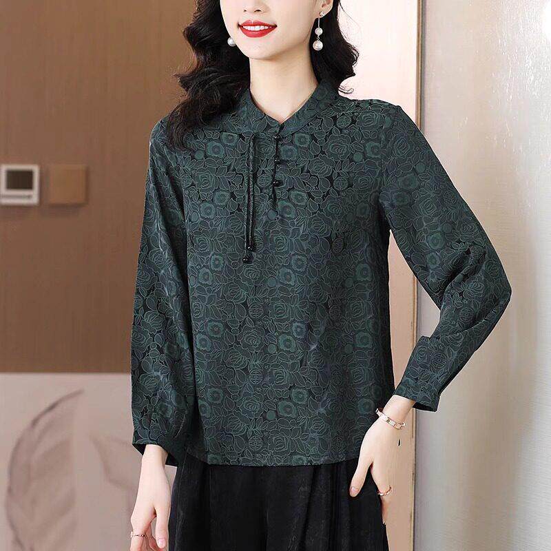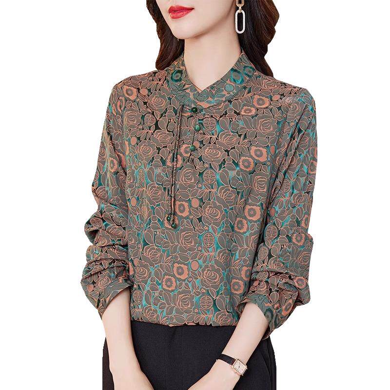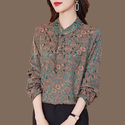 香云纱提花上衣女中老年长袖小衫春秋新中式洋气高贵妈妈真丝衬衫