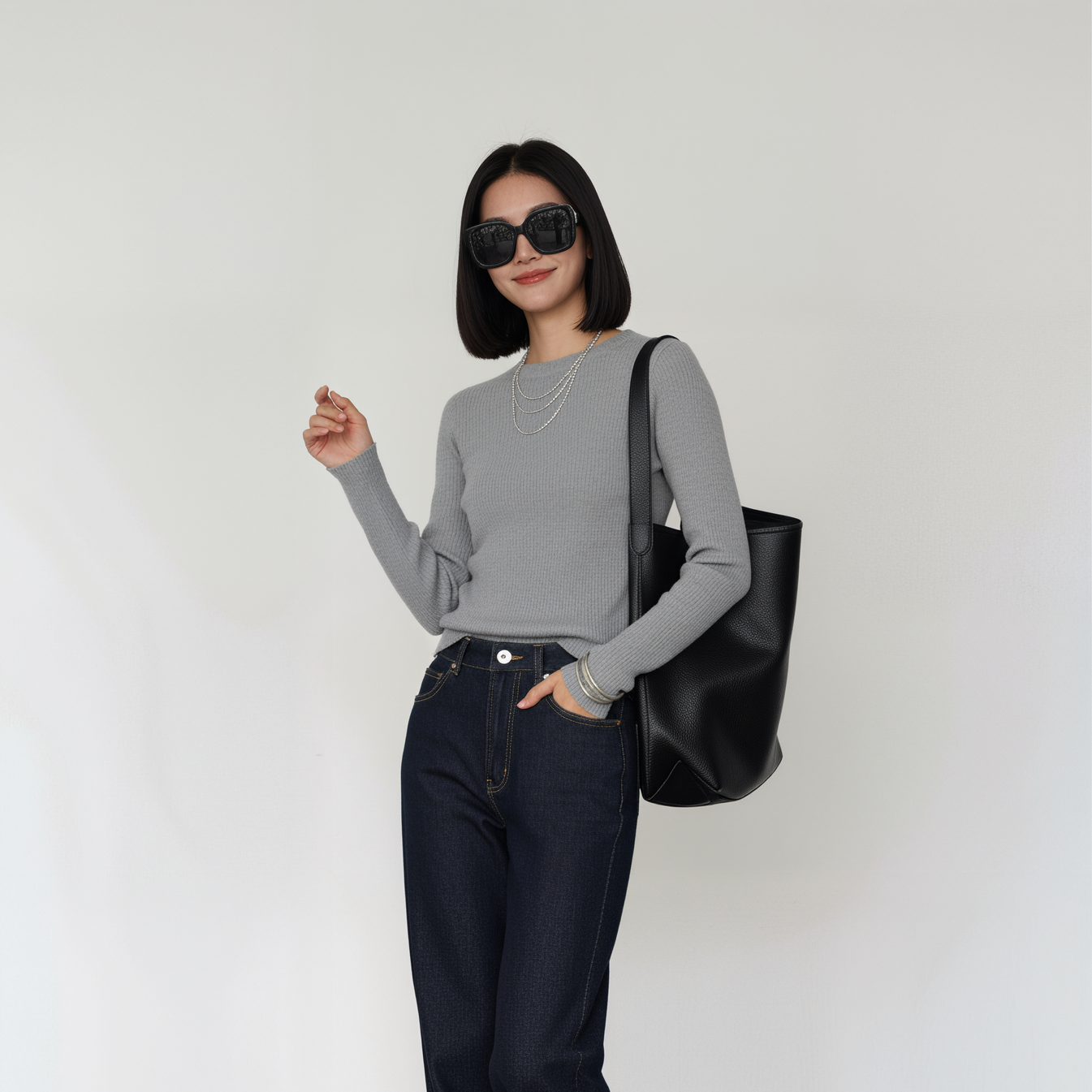 2025秋冬新款纯色圆领羊毛长袖T恤女简约中淑风细针针织打底衫