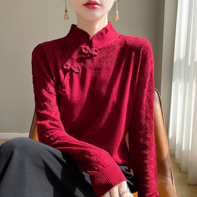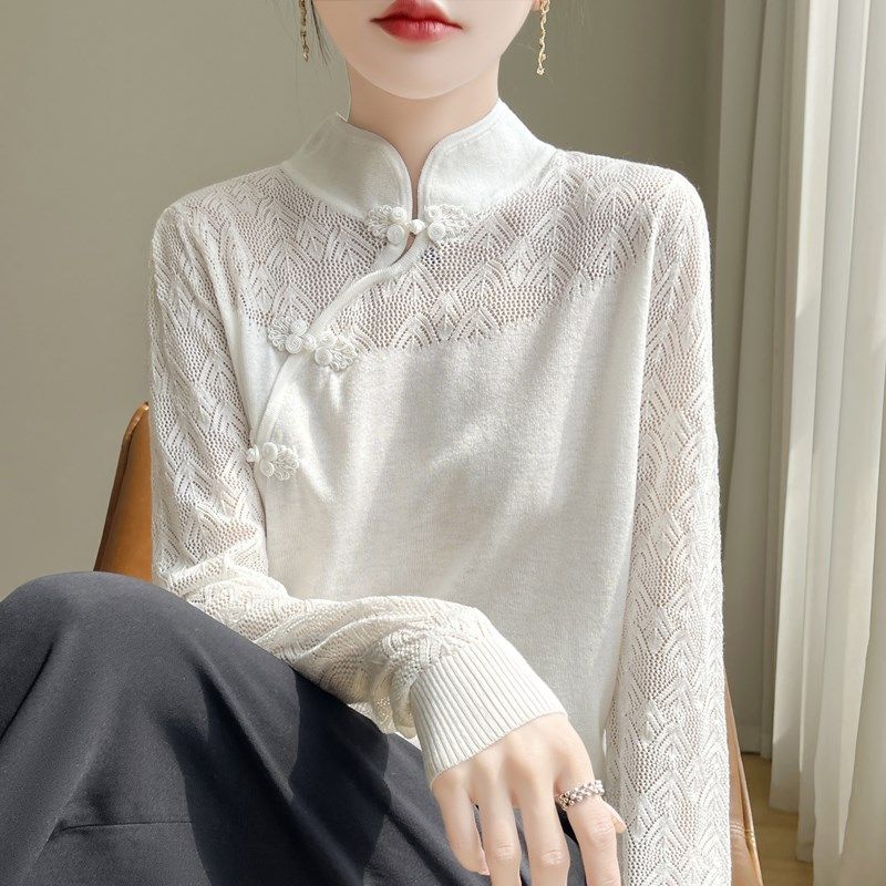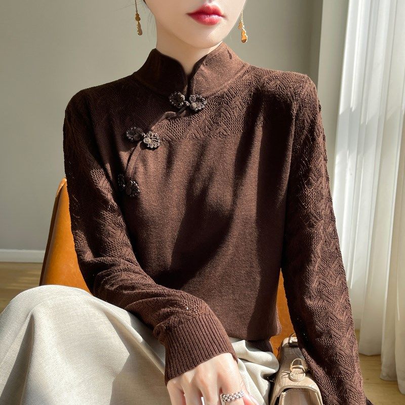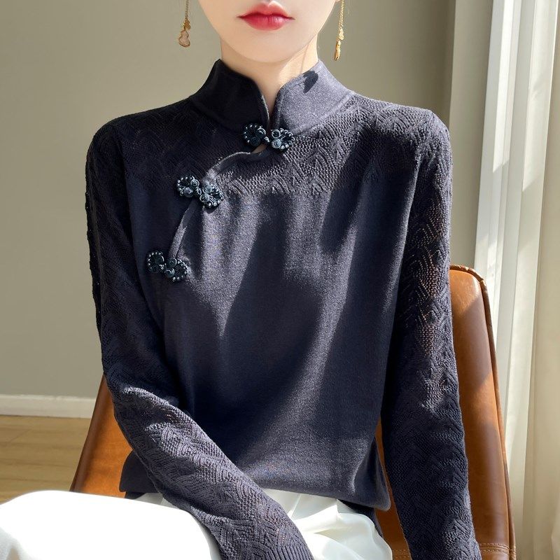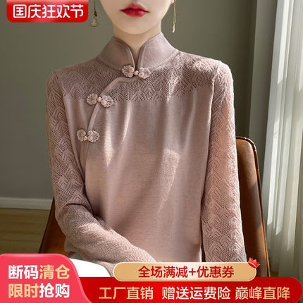 春秋复古新中式精纺羊毛衫女立领盘扣针织长袖毛衣宽松镂空打底衫