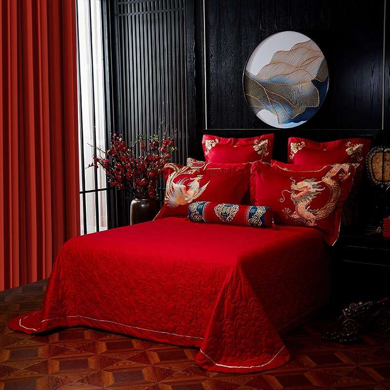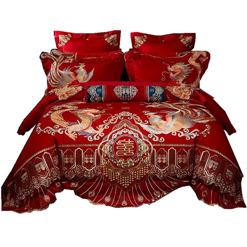 140支长绒棉婚庆四件套全棉纯棉龙凤被大红床上用品结婚六十件套