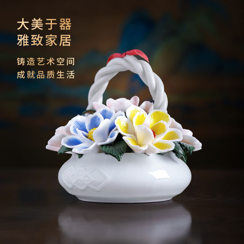 素茗新中式手工捏制瓷花小花篮客厅酒柜博古架书房摆件工艺品装饰