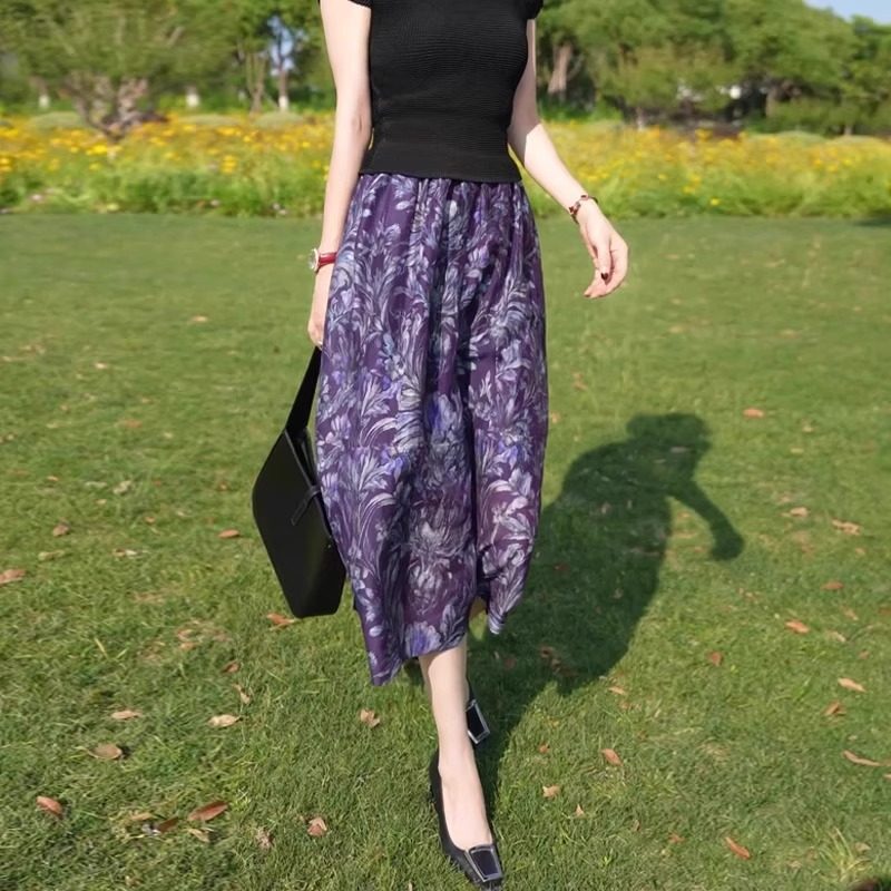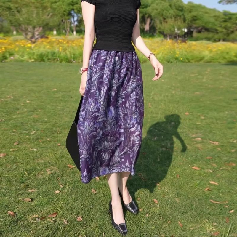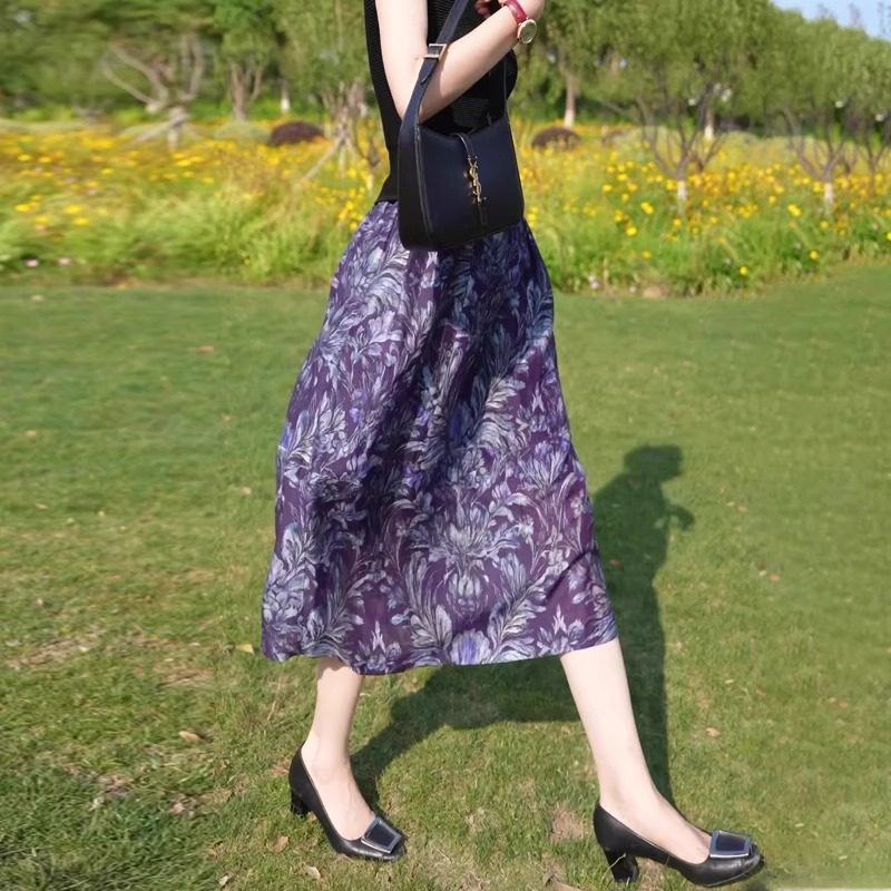 2025夏季新款紫色印花半身裙女显瘦气质透气冰凉轻薄花苞A字裙子