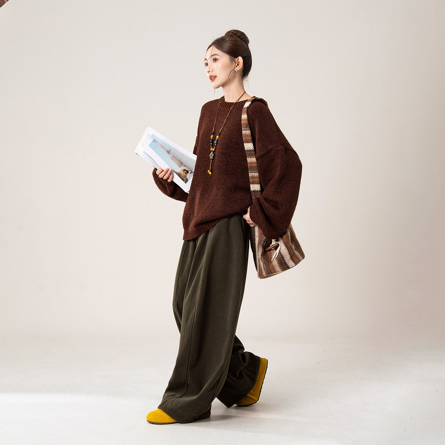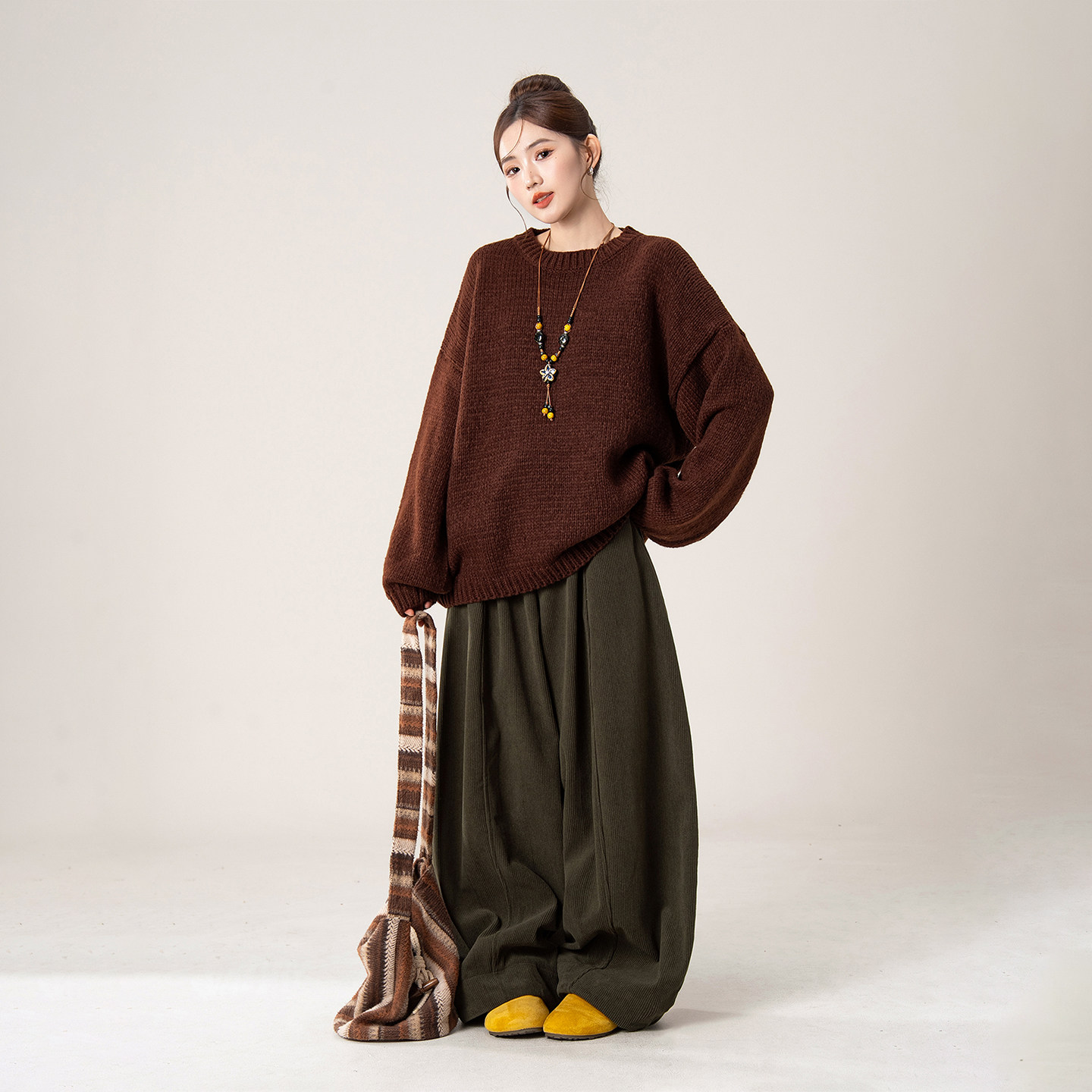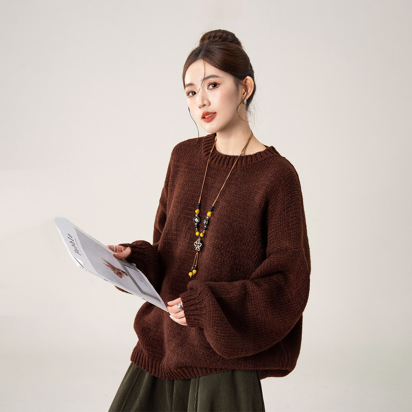 摩卡棕色慵懒高级感圆领套头毛衣