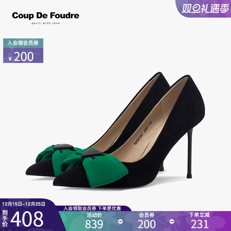 CDF秋款新款百搭撞色绒面蝴蝶结高跟鞋女细跟设计感气质尖头单鞋