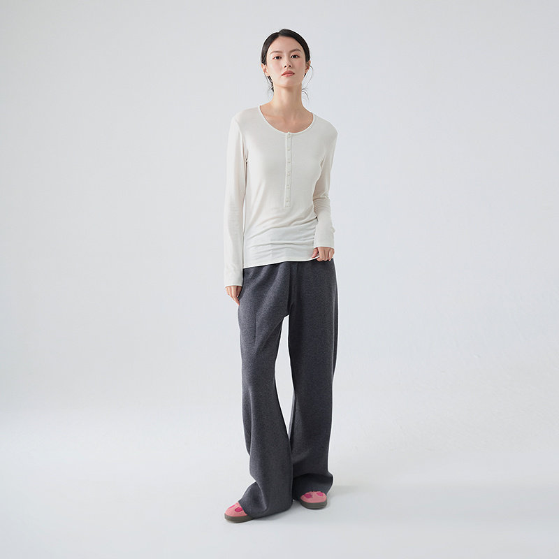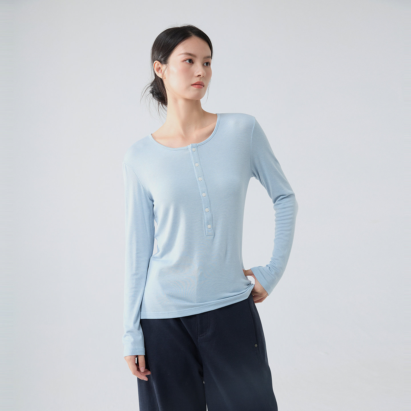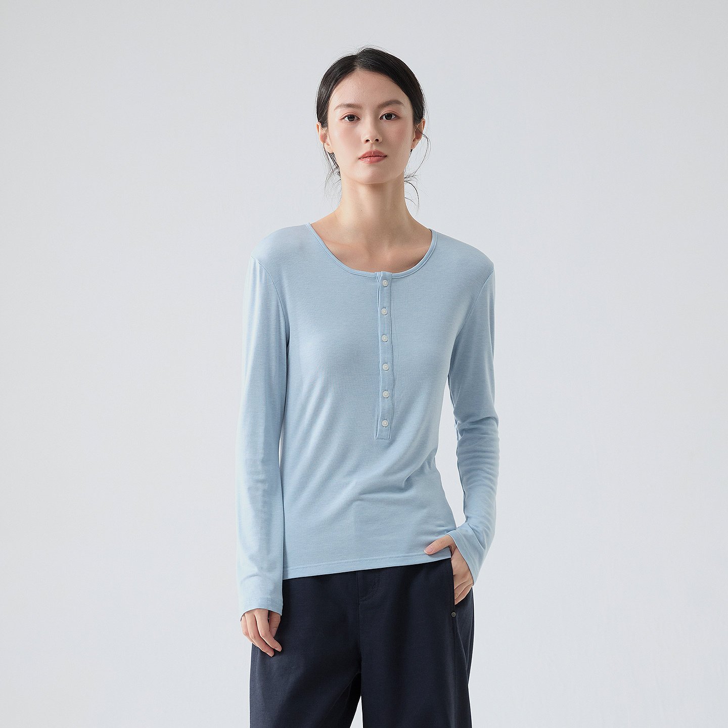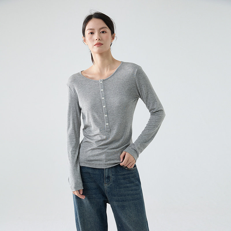 Yifini/易菲2025秋冬新款修身圆领排扣打底衫女百搭通勤针织T恤