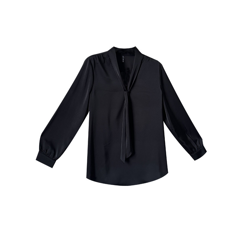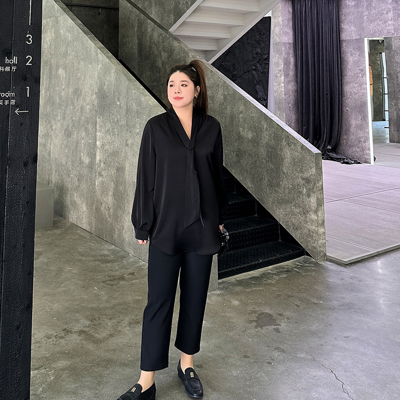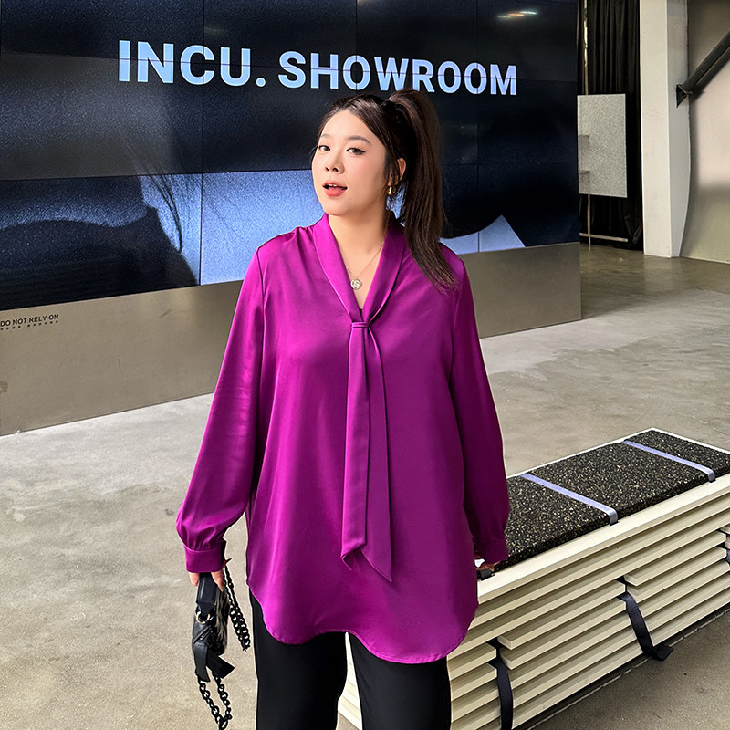 免烫缎面宽松大码衬衫女秋装200斤胖妹妹mm气质显瘦v领中长款衬衣