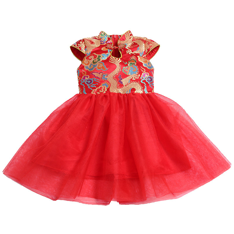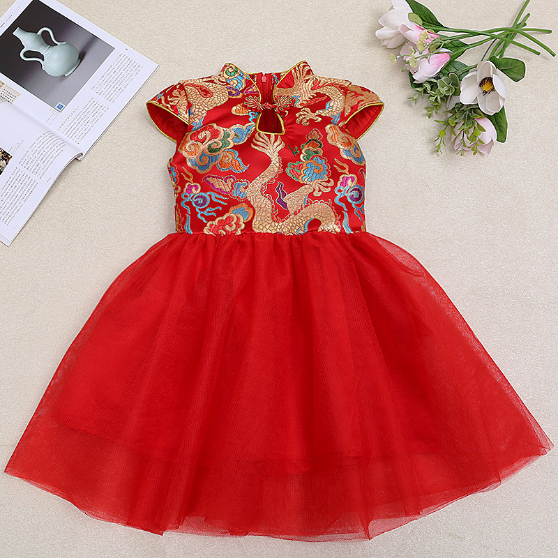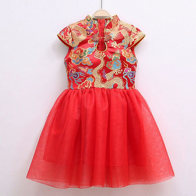 儿童旗袍演出服中国风红色唐装女童古筝表演公主裙说唱六一装礼服