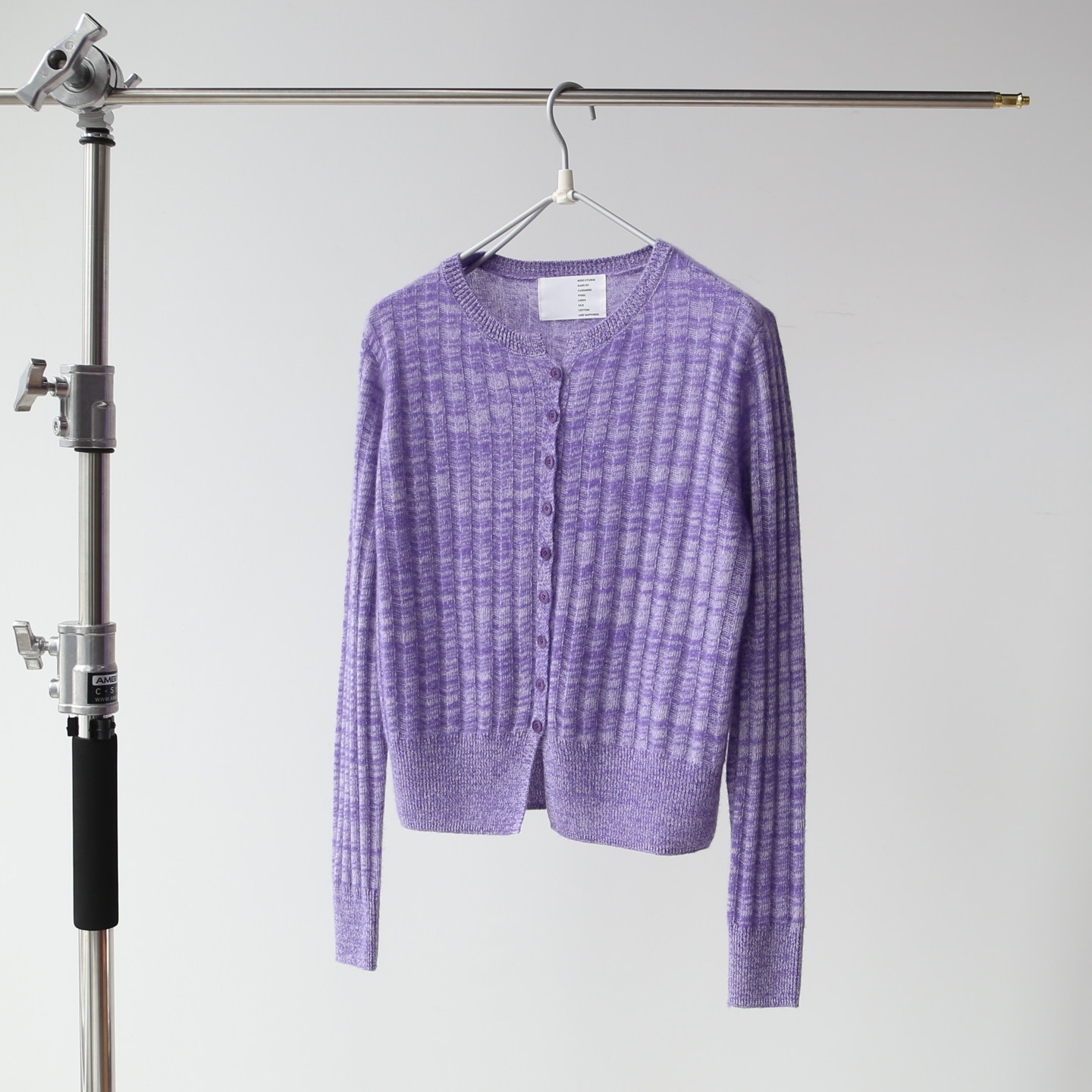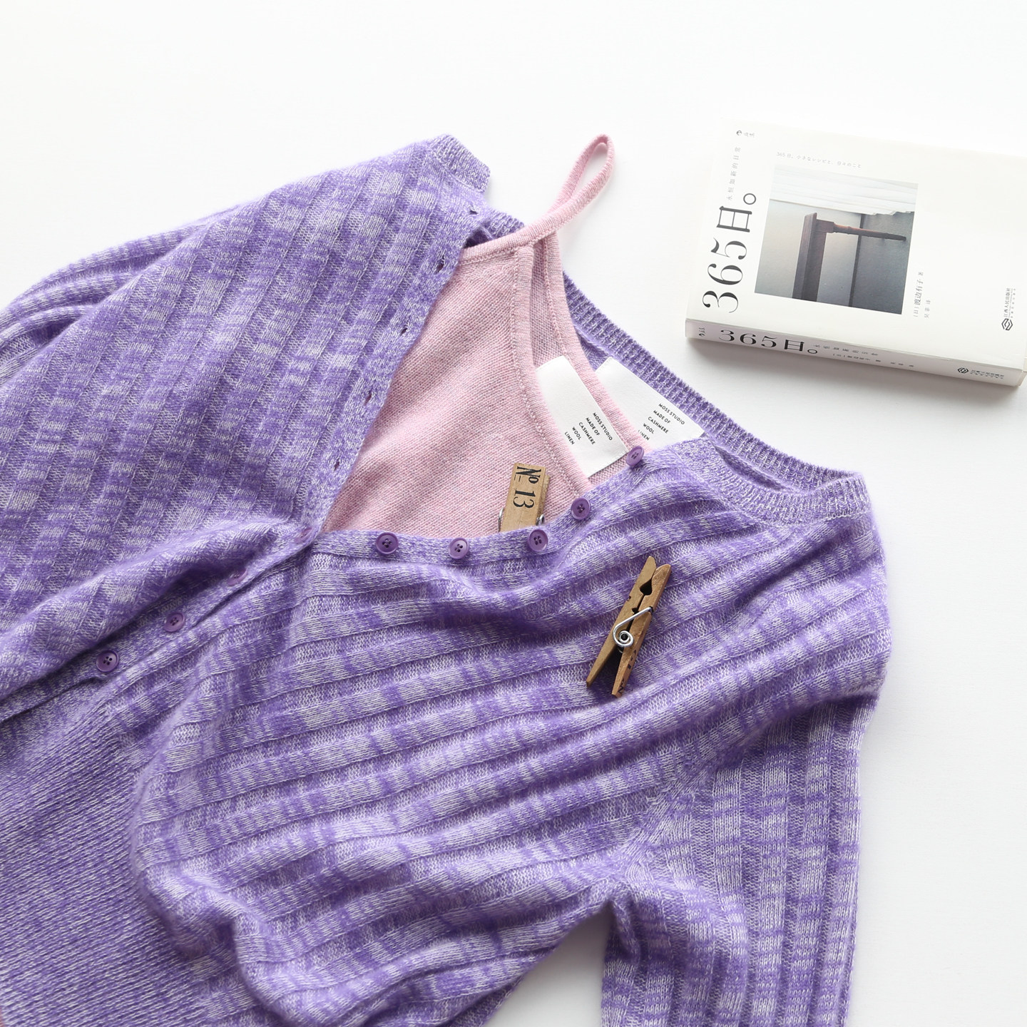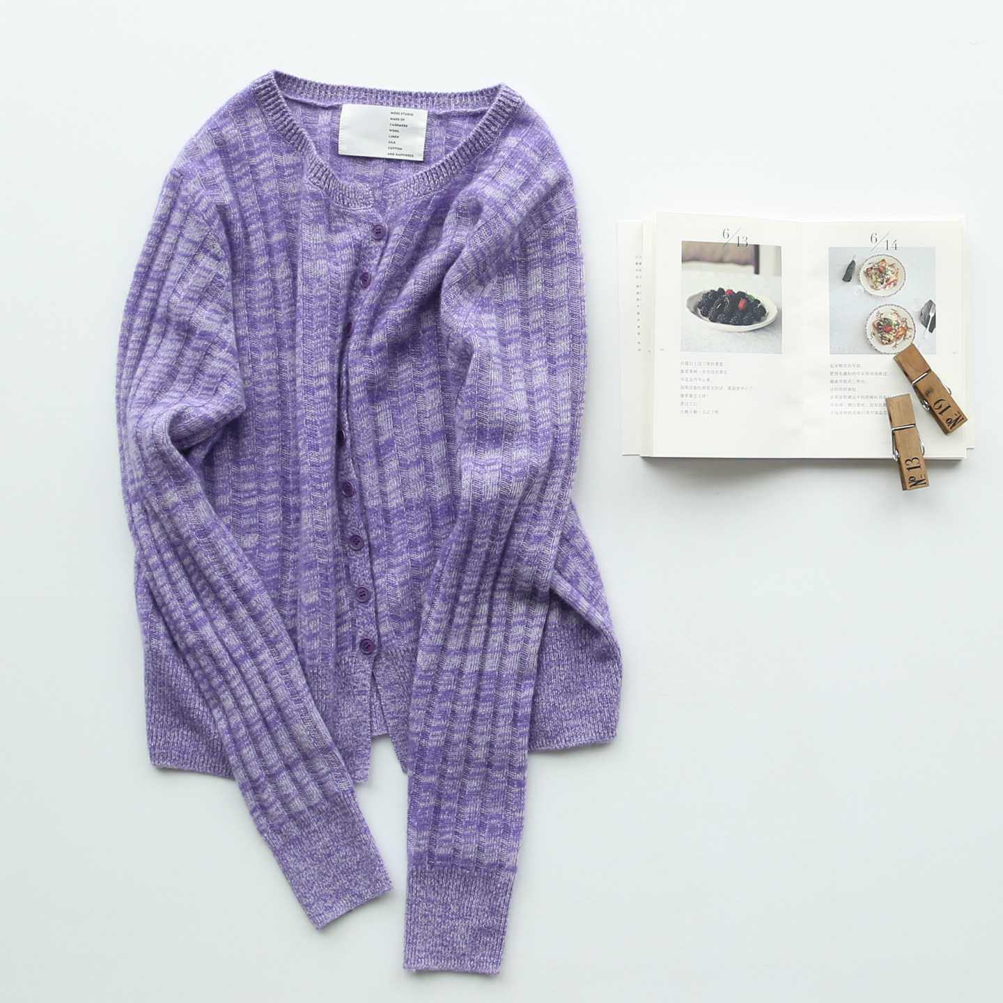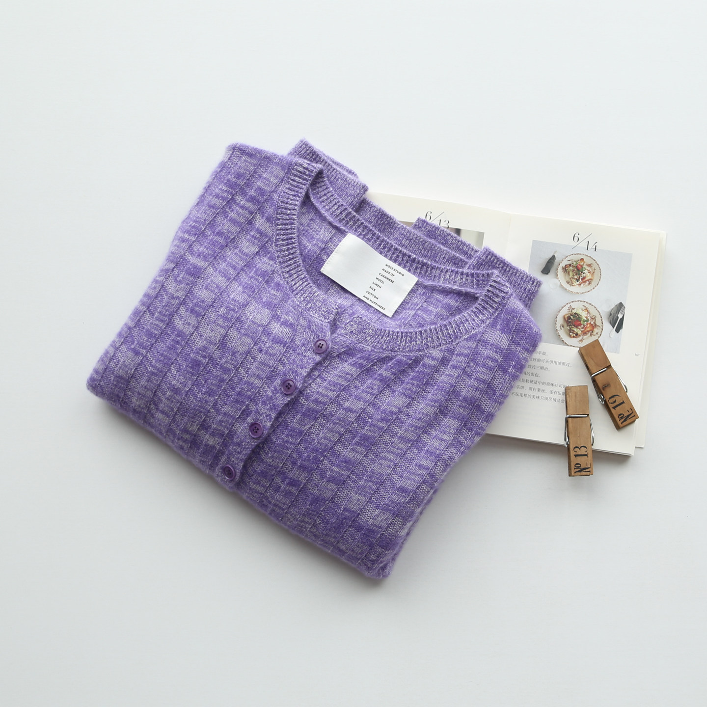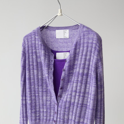 秋冬女士紫色气质显白保暖舒适花纱夹花山羊绒针织开衫毛衣上衣