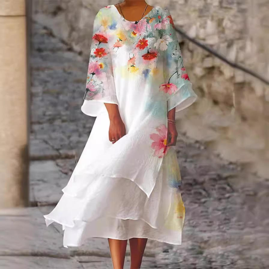 2024年夏季女气质长裙圆领复古甜美印花连衣裙七分袖基本款英伦风