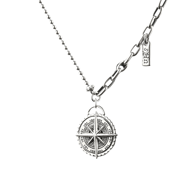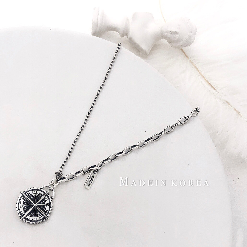 韩国东大门s925纯银八芒星转运圆牌项链女复古毛衣链银饰潮男礼物