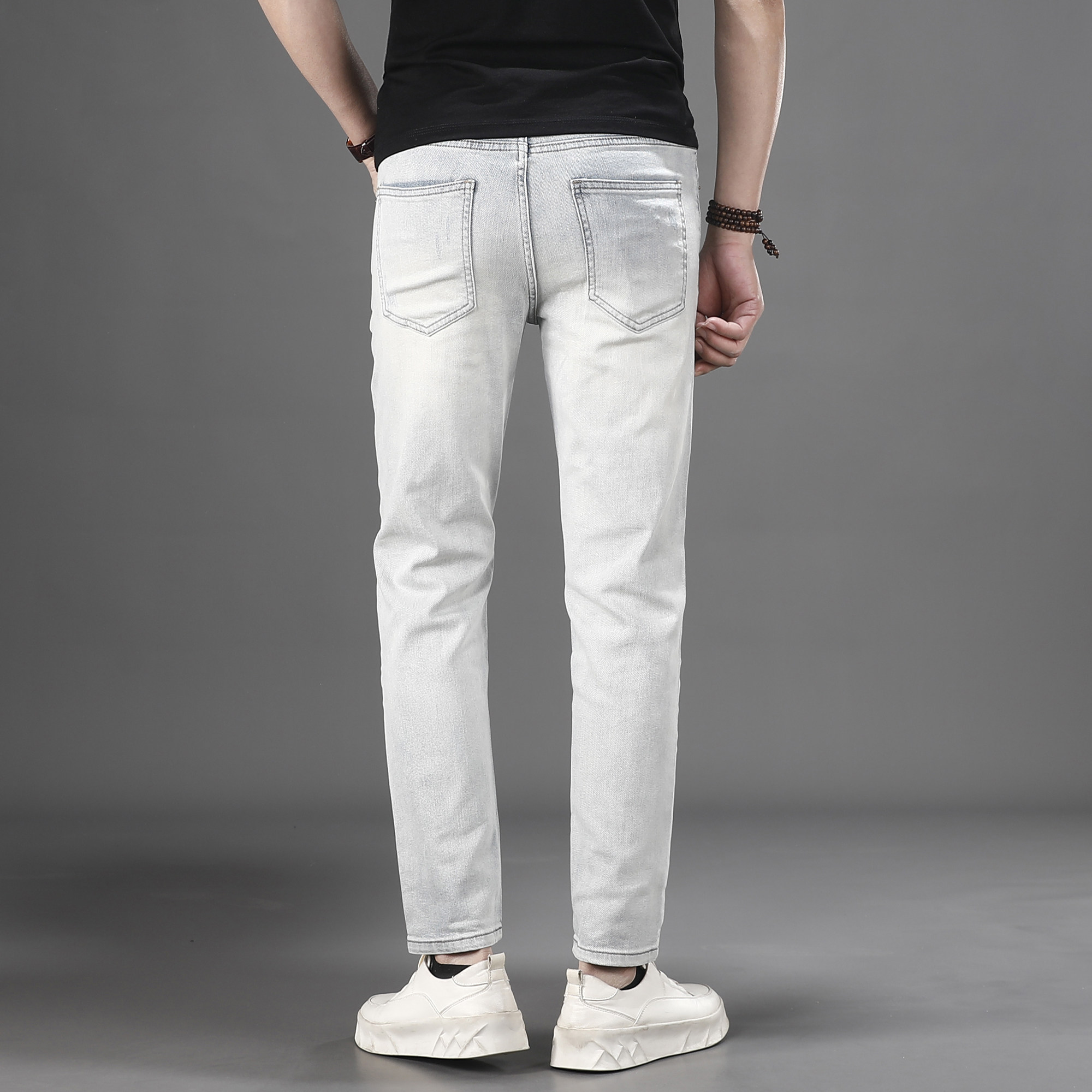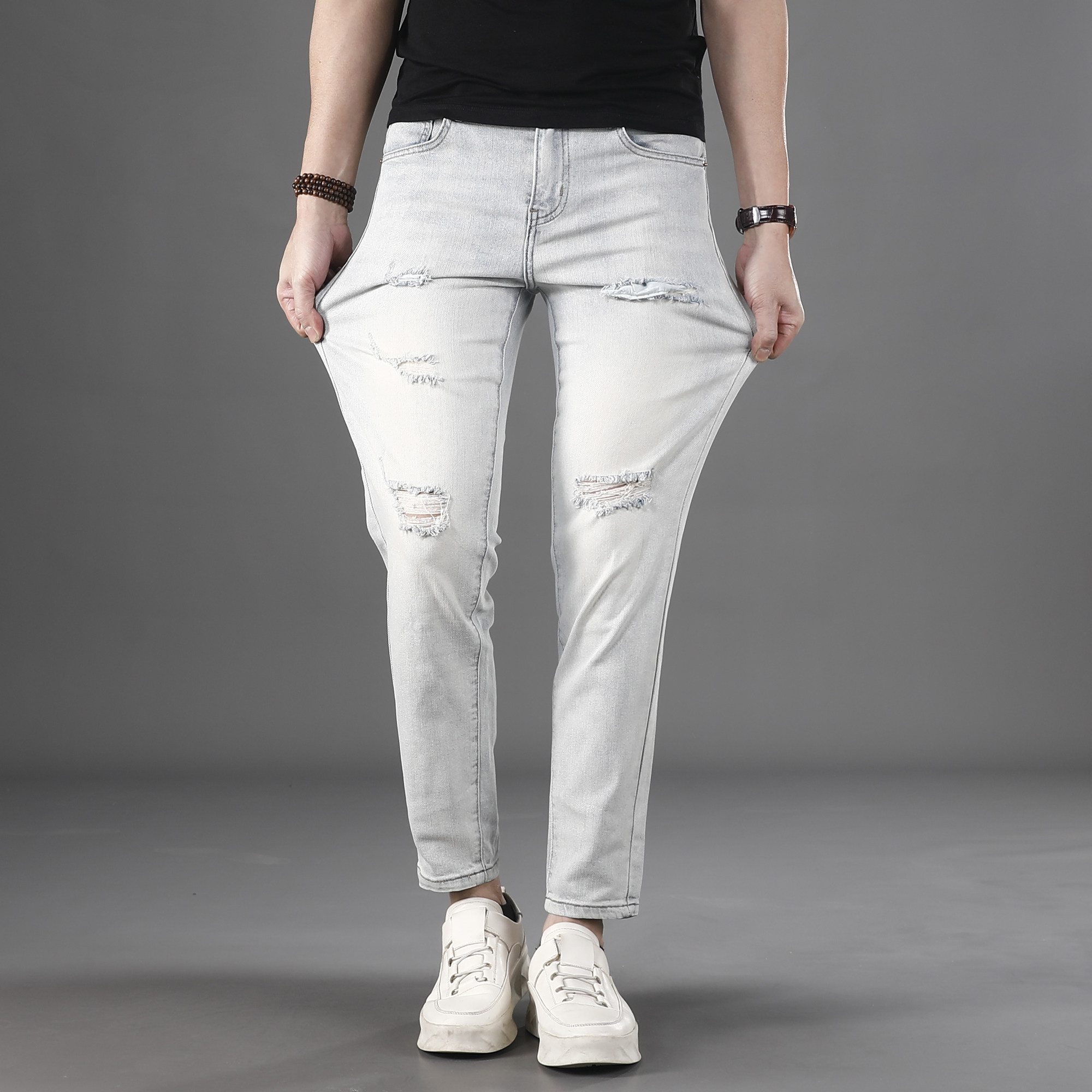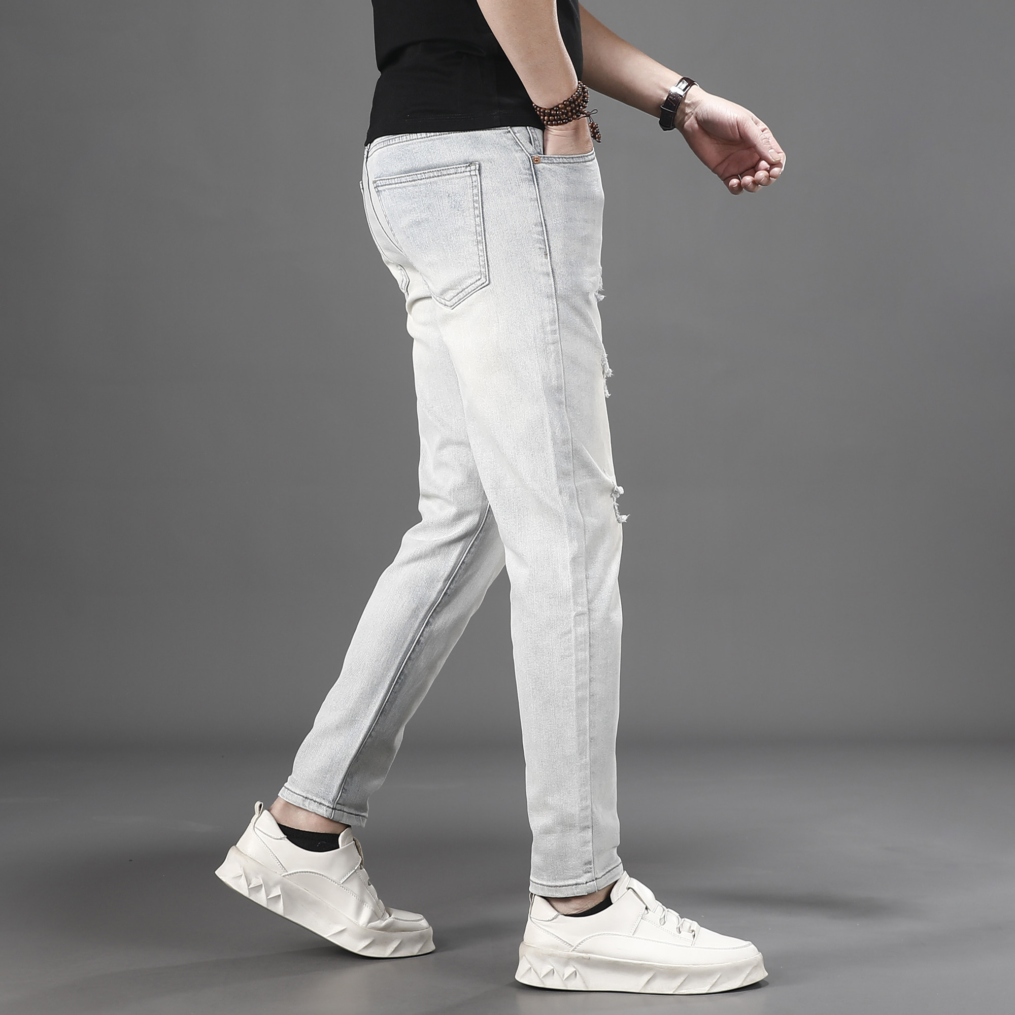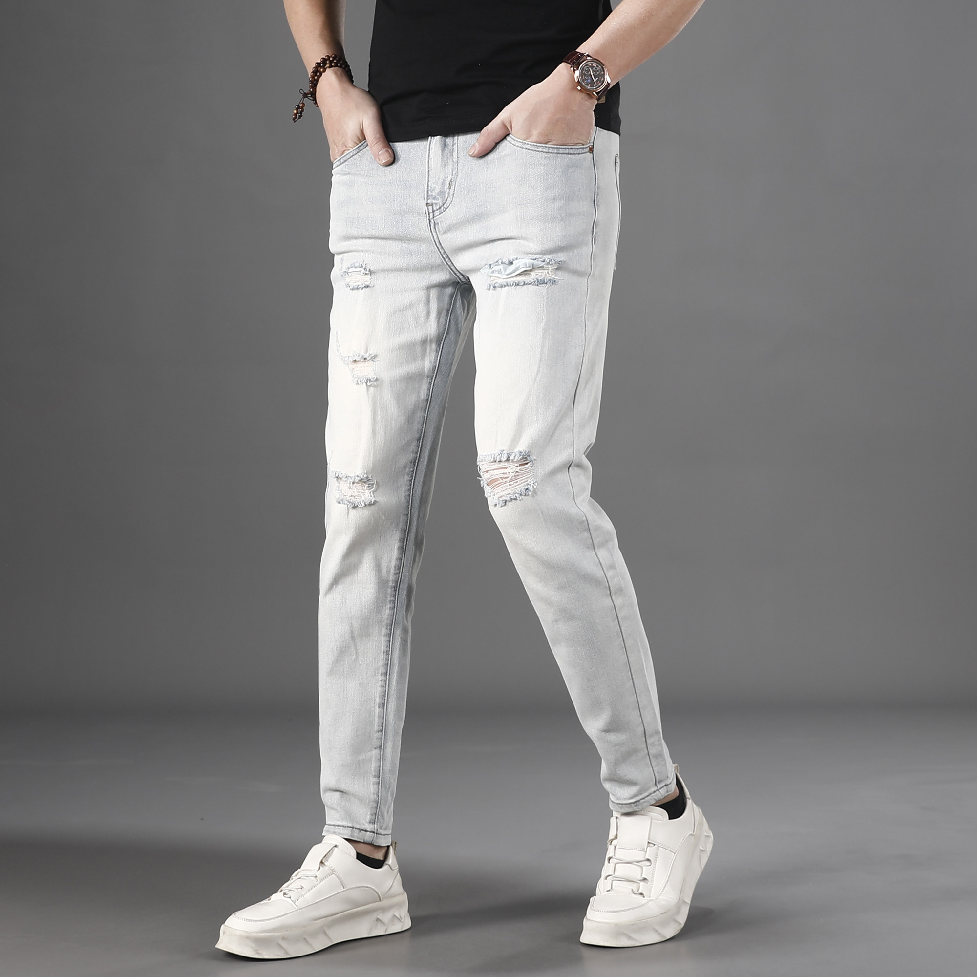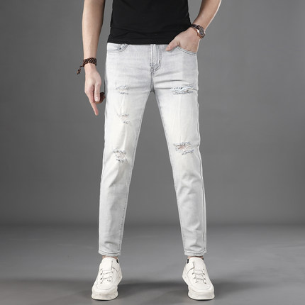 膝盖破洞九分牛仔裤男2026夏季薄款浅色休闲百搭修身小脚9分裤子